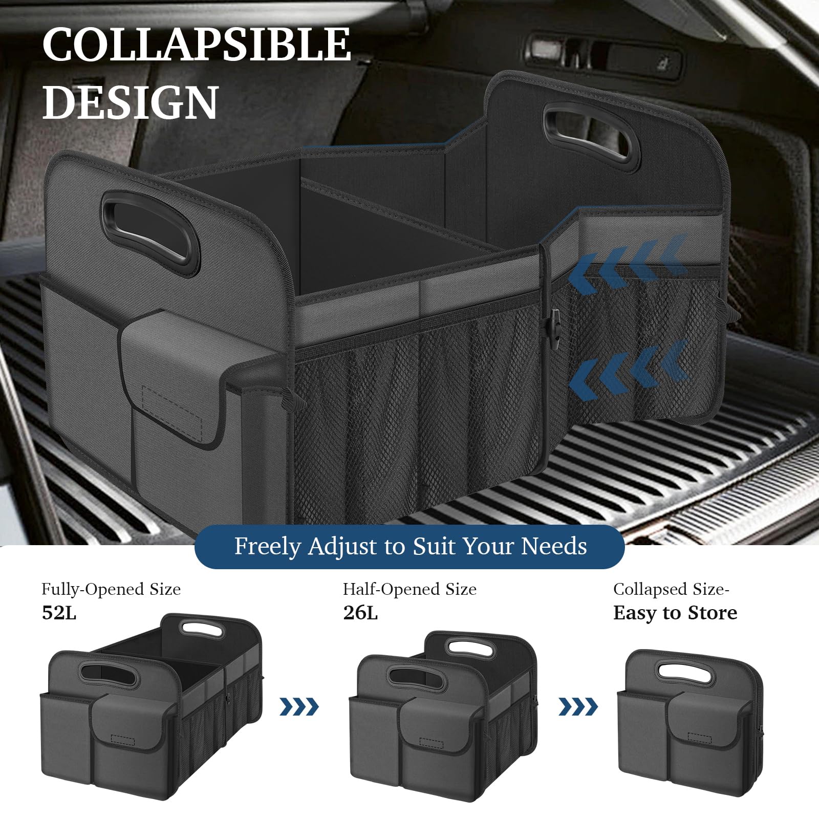 【Collapsible Trunk Storage】:The trunk organizer for suv collapsible multi compartments with removable divider can fold the size that you need in your car interior and fold away when not in use. Foldable and portable.