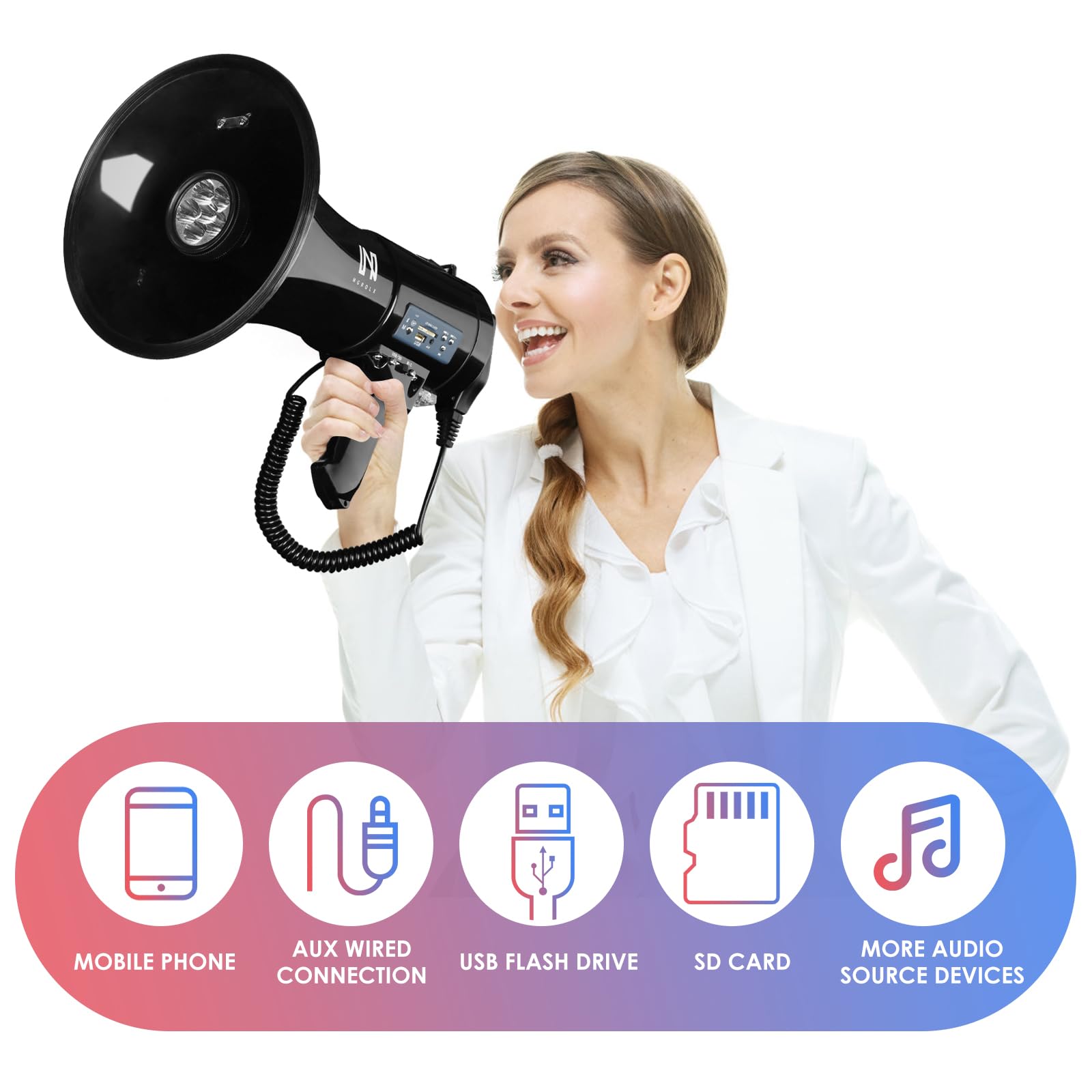 Powerful And Multipurpose:MGROLX PRO LED MEGAPHONE can provide up to 50W and 1500 yard sound which is specially designed for outdoor activities, such as sports activities, political demonstrations, social management and cheerleading activities. In order to be easy to carry, we also equipped it with adjustable straps.
