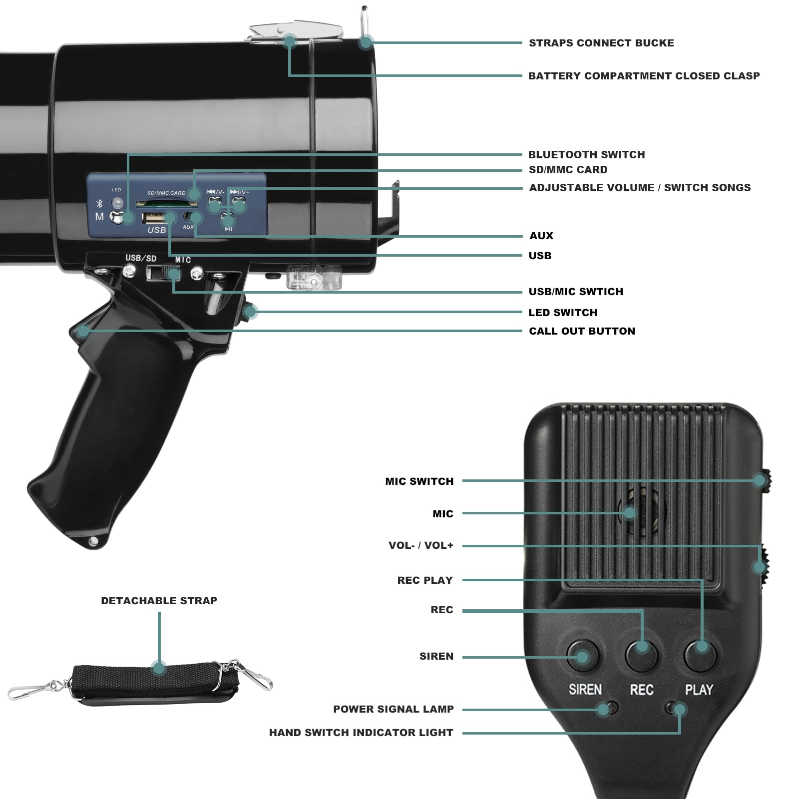 Multiple Input Modes: This bullhorn megaphone speaker supports Bluetooth/3.5mm AUX/USB/SD input.