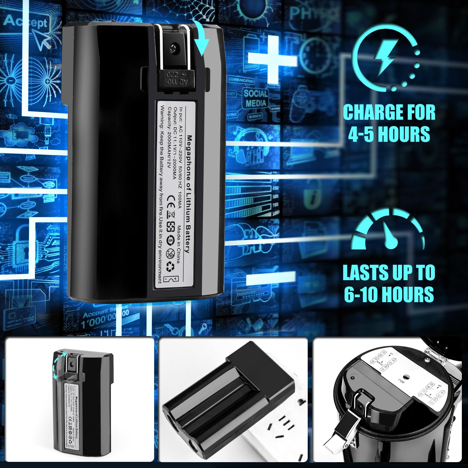 Two Power Modes:This megaphone bullhorn comes with a rechargeable battery, which can realize long-term endurance after one charge. In addition, it also supports 8xC batteries (Not Include). If you need to use it for a long time and worry that the lithium battery life is not enough, you can take 8xC batteries in case of need.
