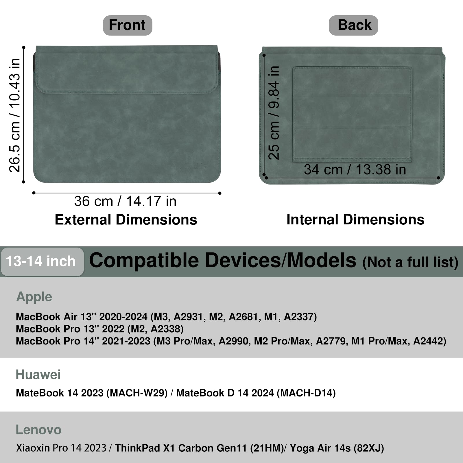 Dimension: External dimensions: 14.17 x 10.43 inches. Internal dimensions: 13.38 x 9.84 inches. Compatible Models: MacBook Pro 14" 2021-2024 (M1 M2 M3 M4 Pro/Max A2442, A2779, M3 A2918, A2992, M4 A3112, A3401, M4 Max A3185)/MacBook Air 13" 2010-2017 (A1466 A1369)/MacBook Pro 13" 2010-2015 (A1502 A1425 A1278). Also compatible with other brands of laptops