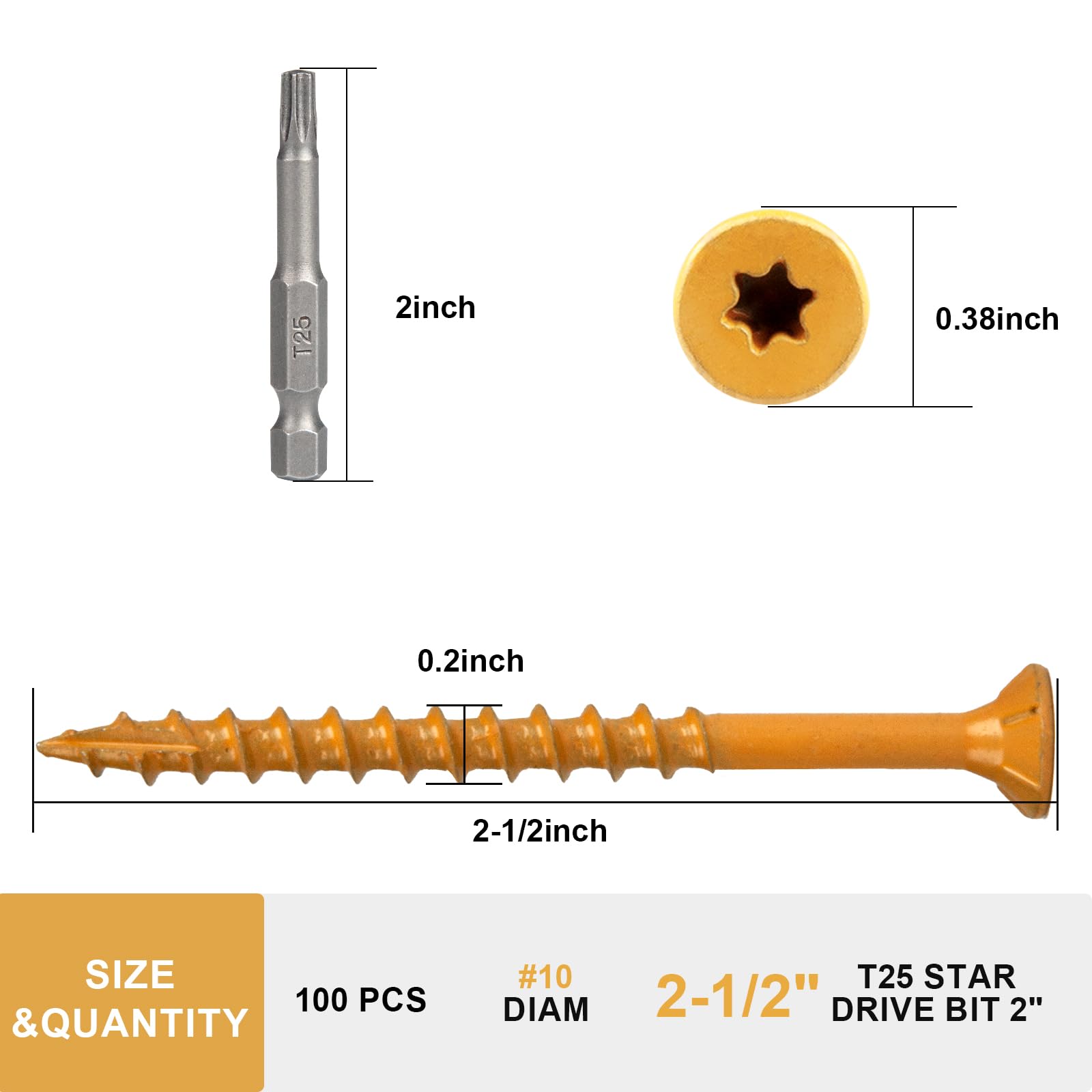 Product Packaging: #10×2-1/2 inch high-quality carbon steel deck screws, 100 pieces, With T-25 star drive drill bit. Fmjdnls Deck Screws are arranged in a beautiful container box for convenient storage, Easy identification