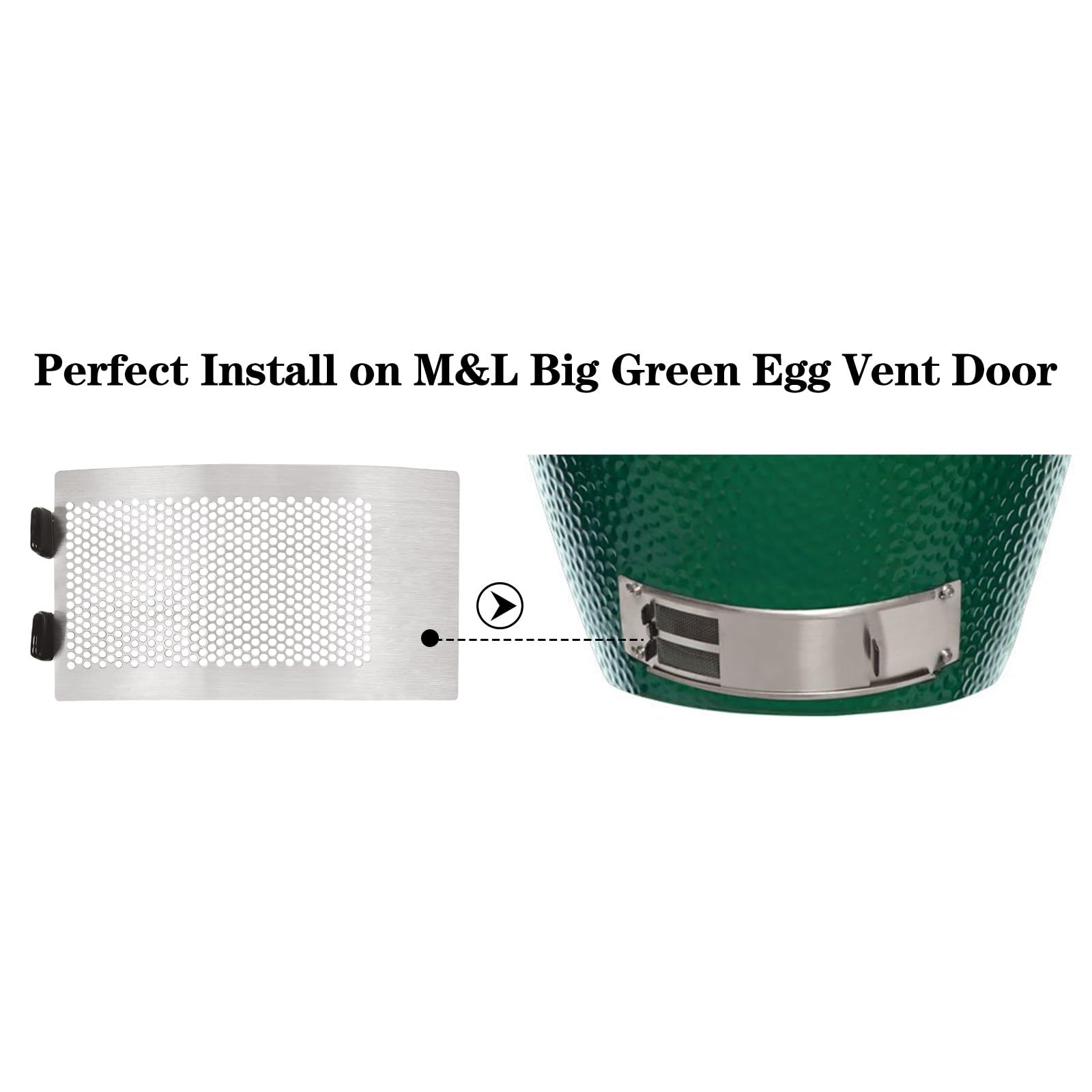 【100% STAINLESS STEEL】Our green egg draft doors are made of stainless steel material, Stainless material has retained original color after a couple of months of use,and will not rust.eliminates any corrosion between the two dissimilar stainless steels on the original draft doors.Punched Mesh Screen fit for Medium & Large Big Green Egg Vent perfectly,Worth it for every BGE owner.