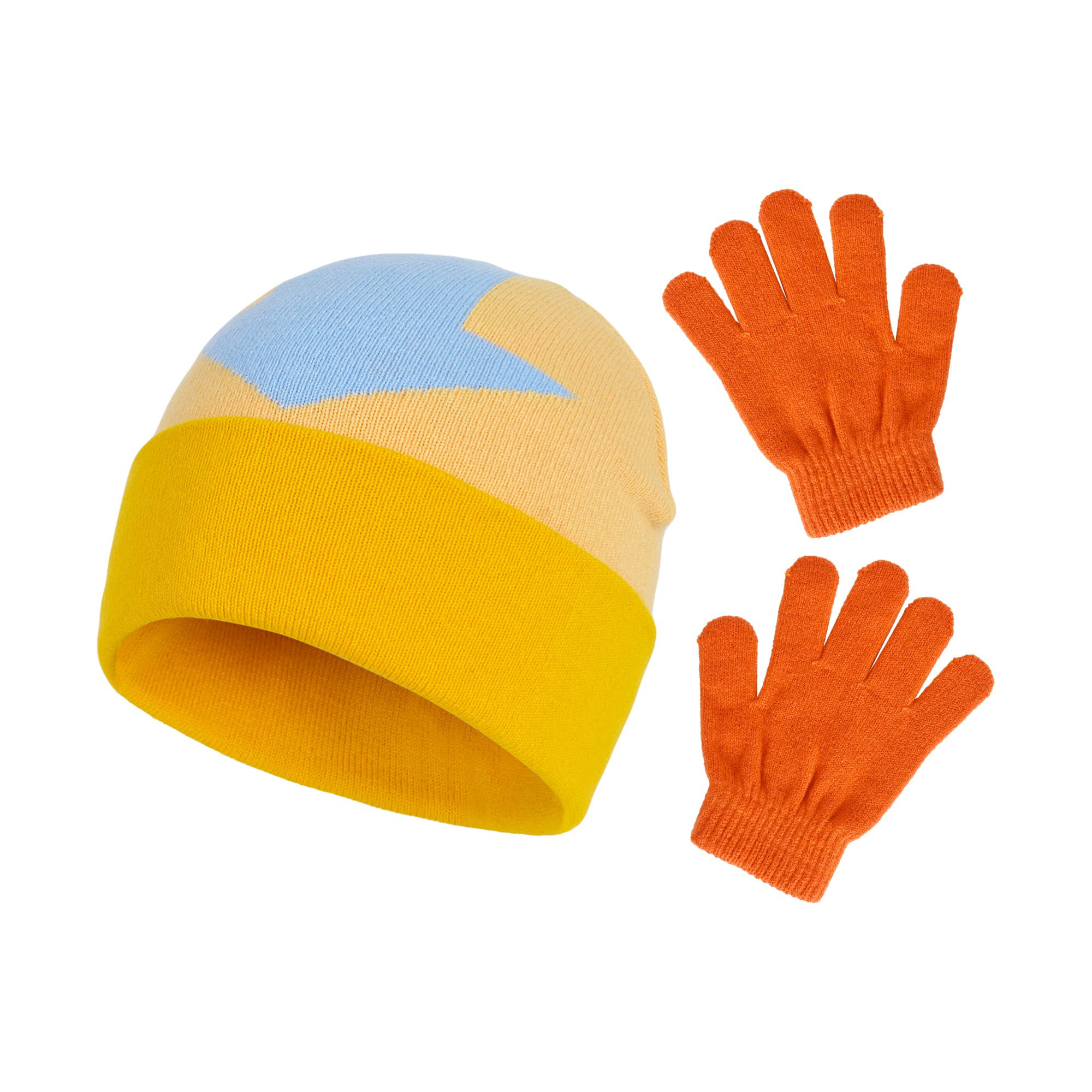 THE LAST AIRBENDER BEANIE AND MATCHING GLOVES FOR CHILDREN: Avatar Aang cuffed beanie featuring a blue arrow mark and matching orange gloves