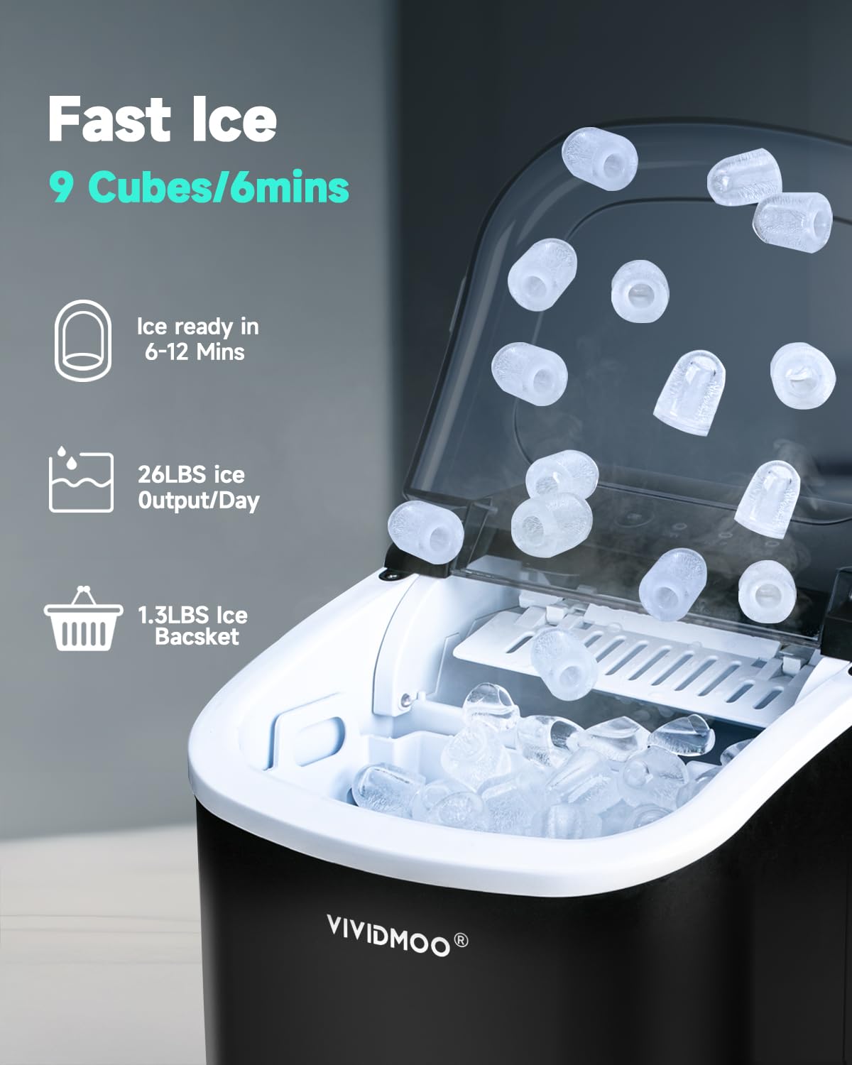 6-Minute Fast Ice Making And Ultra Quiet Operation: Vividmoo ice maker produces the first batch of bullet shaped ice cubes in 6 minutes. Equipped with a 1.2L water tank and a powerful compressor, the daily ice making capacity reaches 26 pounds and the ice storage capacity is 1.3 pounds. The operating noise is below 45 decibels, quiet and not disturbing.