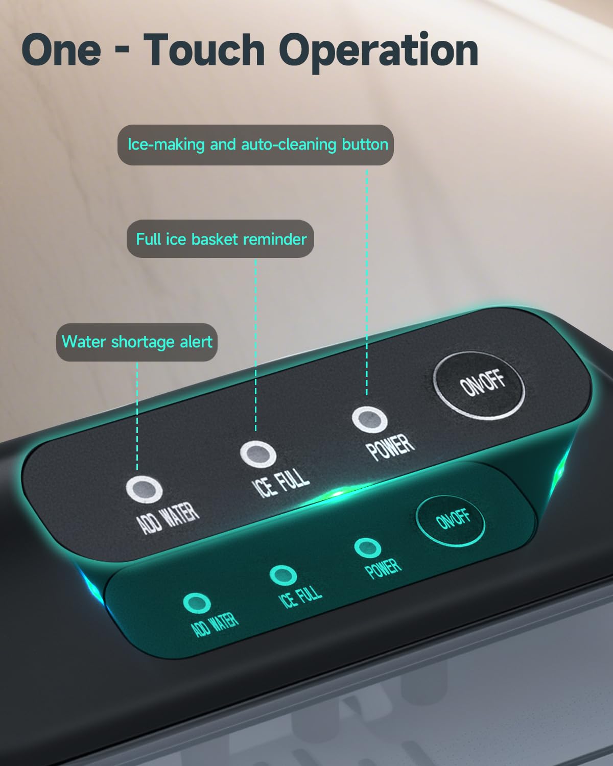 Humanized Design, Energy-Saving And Efficient: Visualized large window for real-time viewing of ice making status, 170W upgraded compressor consumes 4kWh of electricity per day, energy-saving and power-saving. The operation panel can quickly make ice in two simple steps adding water and press "ON/OFF".