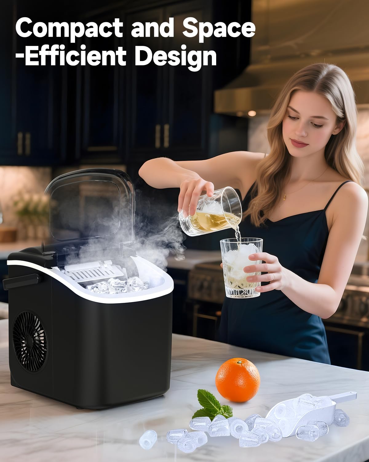 Portable Design, High-Quality Ice Type: weighing only 13.89 pounds, with a compact body (11.57*11.42*8.74 inches) and a handle for easy carrying, suitable for multiple scenarios such as kitchens, camping, parties, etc. Specially made bullet shaped ice cubes, smooth and non stick, suitable for cold drinks, iced coffee or direct chewing.