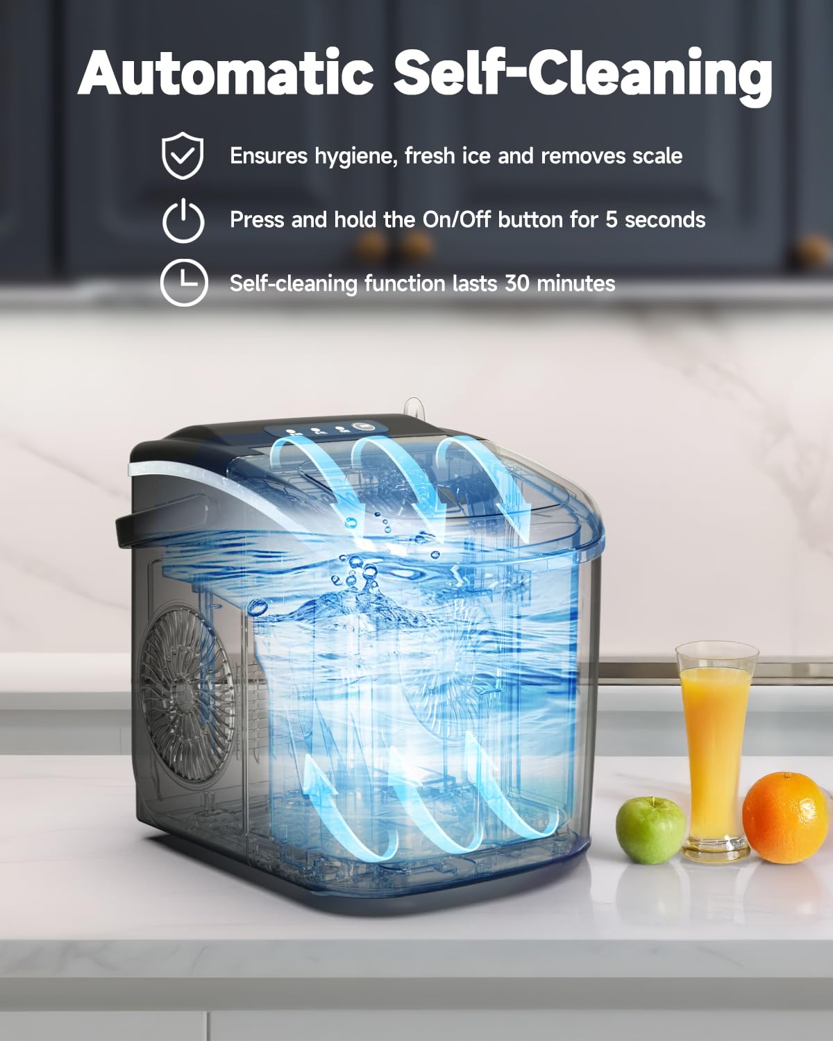 Intelligent Operation, One Click Self-Cleaning: The infrared sensing system automatically prompts "ICE FULL" full ice and "ADD WATER" water shortage status. Support one click self-cleaning function, press and hold the power button for 5 seconds after adding water, and the cleaning will be automatically completed in 30 minutes.
