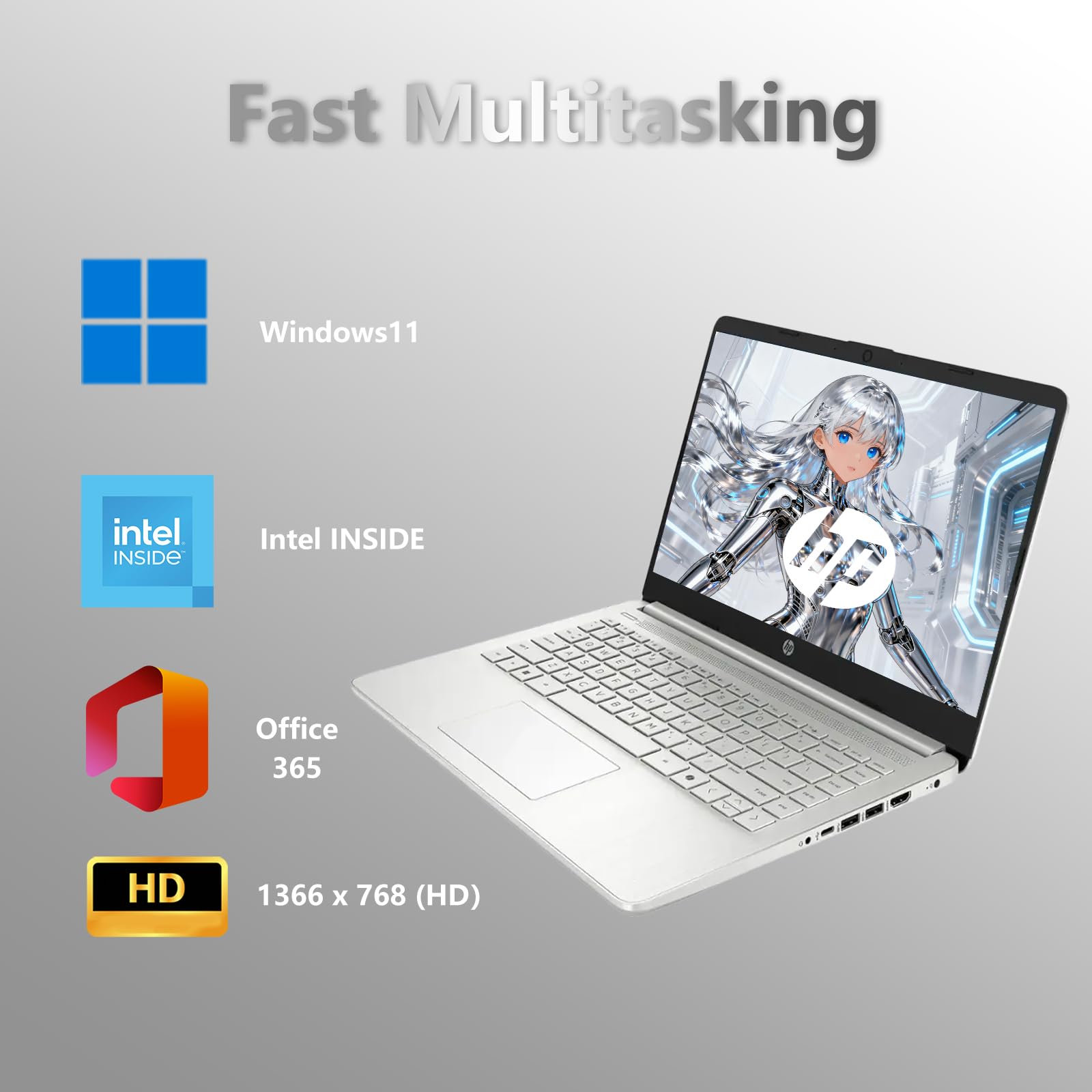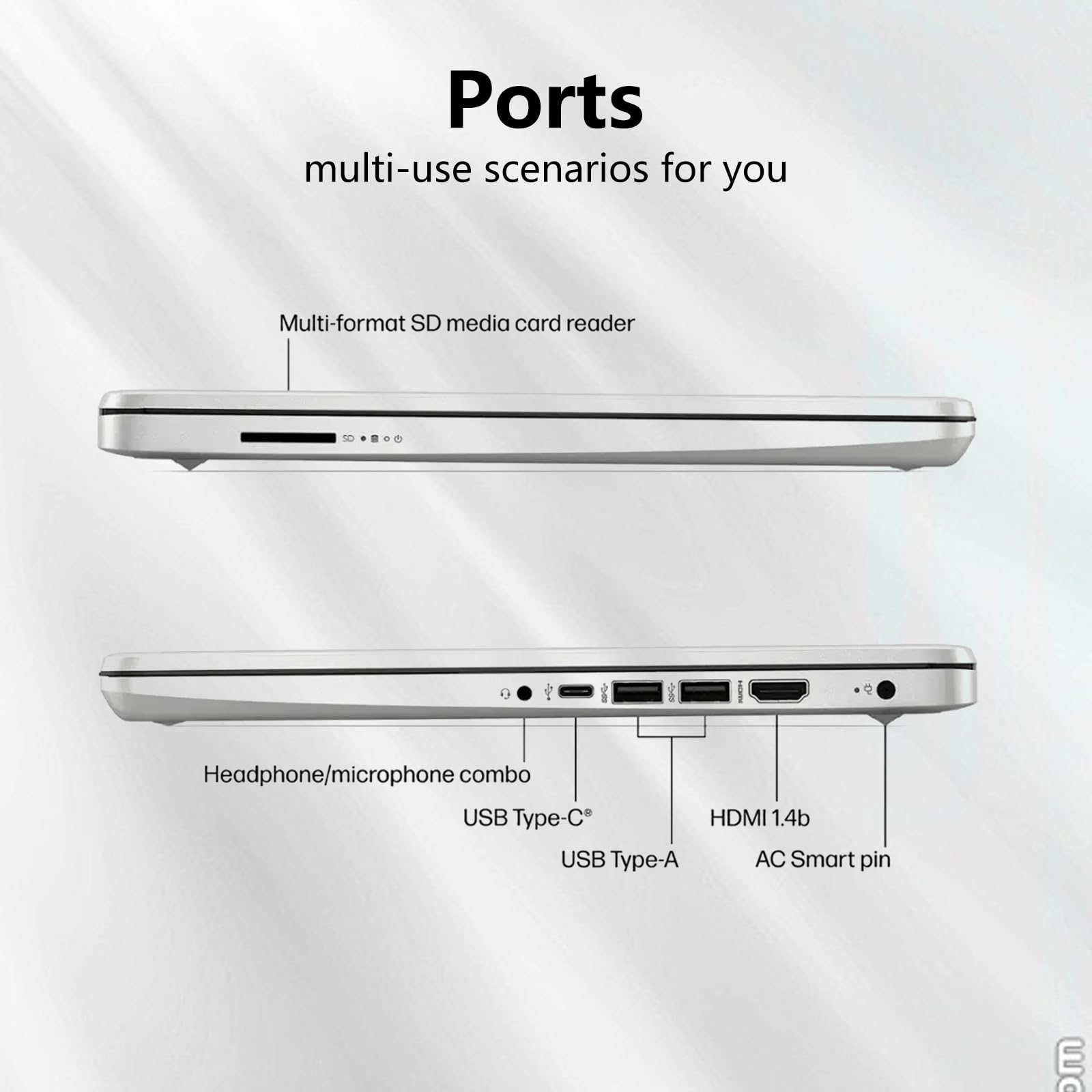 HP 14 Laptop The most suitable ultra-lightweight and cost-effective laptop for work and study. Processor: Intel Celeron N150, 4 Cores, 4 Threads, Up to 3.60 GHz Burst Frequency, 6 MB Cahce. Graphics: Intel Graphics Operating system: Windows 11 Software: Free 1-year Microsoft Office 365 Subscription Memory: 4GB DDR4 Storage: 1.12TB Storage (128G UFS+1TB Clould) Display: 14-inch diagonal, HD (1366 x 768), micro-edge, anti-glare, 250 nits Connectivity: Wi-Fi 6 and Bluetooth 5.4 combo Audio: HD Audio with stereo speakers Webcam: HP True Vision 720p HD camera with temporal noise reduction and integrated dual array digital microphones Ports: 1x USB Type-C 2x USB Type-A 1x Headphone/microphone combo 1x AC Smart pin 1x HDMI 1.4b Battery: 3-cell, 45 Wh battery, Up to 11.5 hours Dimensions (W x D x H): 12.76 x 8.86 x 0.71 in Weight: 3.24 lbs