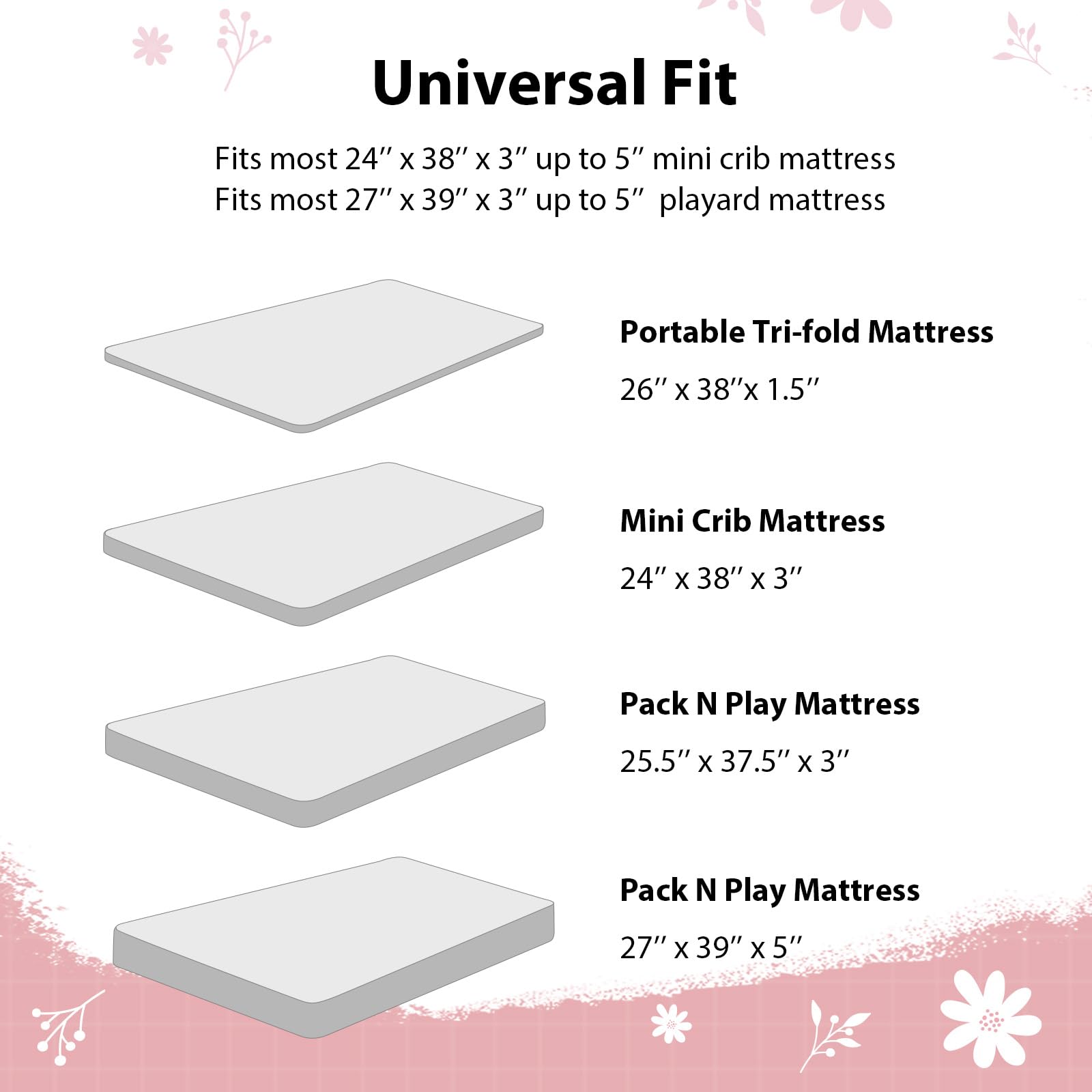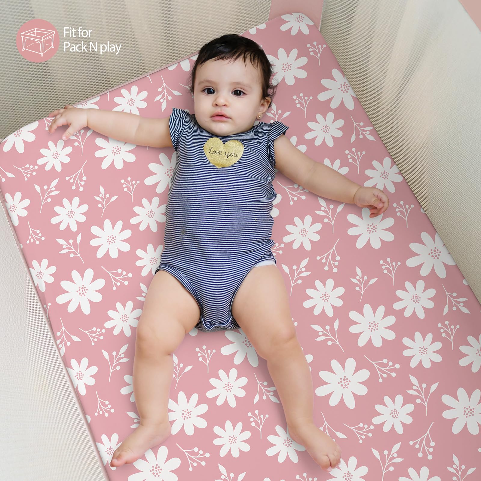 Snug Fit: Measuring 38” x 26”, our 3-pack mini crib sheets fit most baby portable plapens and pack n play mattresses. With elastic bands around the edges of the playard sheets, an 6-inch deep pocket, and stretchy fabric, they ensure a snug, wrinkle-free fit that stays securely in place.