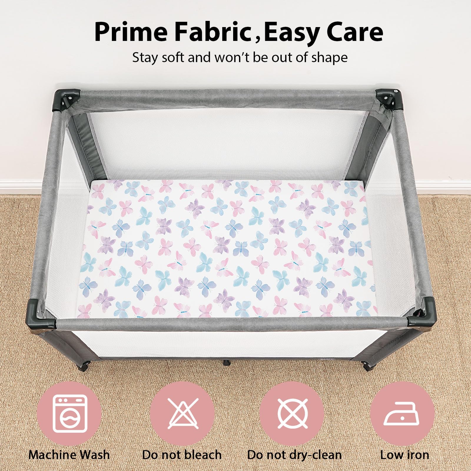 Easy Care & Sustainable: Made from pre-shrunk fabric, our pack n play sheets resist fading, pilling, and shrinking, even after hundreds of machine washes. With double-stitched edges and corners, they are built to last, ensuring comfort for your baby.