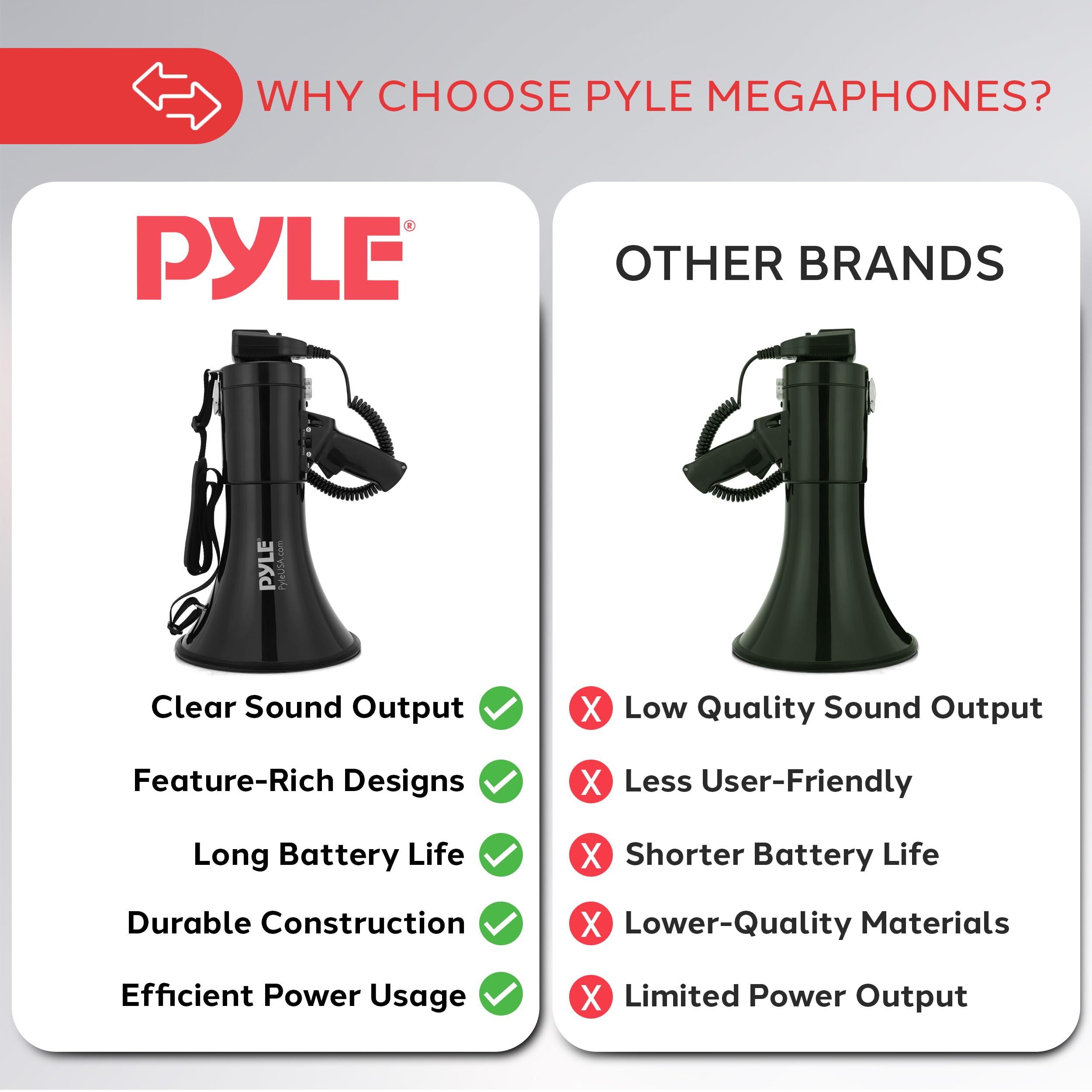 POWERFUL AUDIO OUTPUT - This megaphone offers: Talk, Siren, Music, Whistle, and Record (up to 60 seconds). It features a button-activated automatic siren alarm and delivers a powerful 50-Watt MAX output, ensuring your message is heard loud and clear.