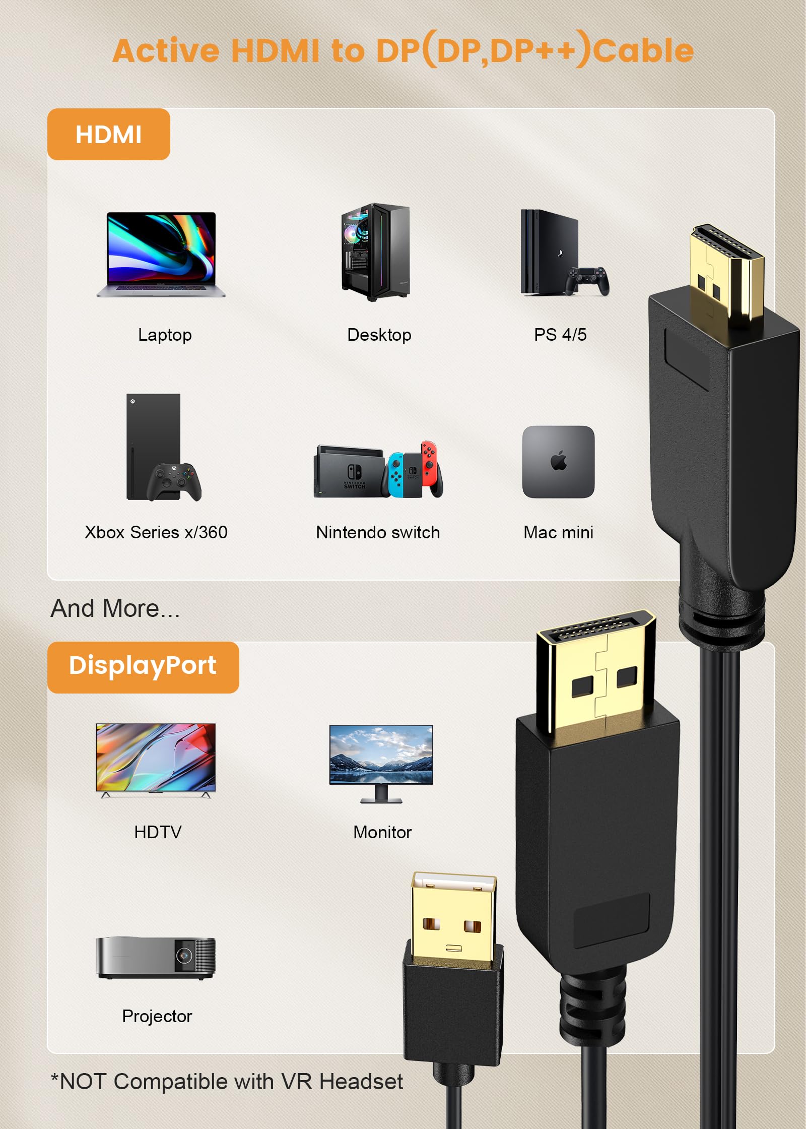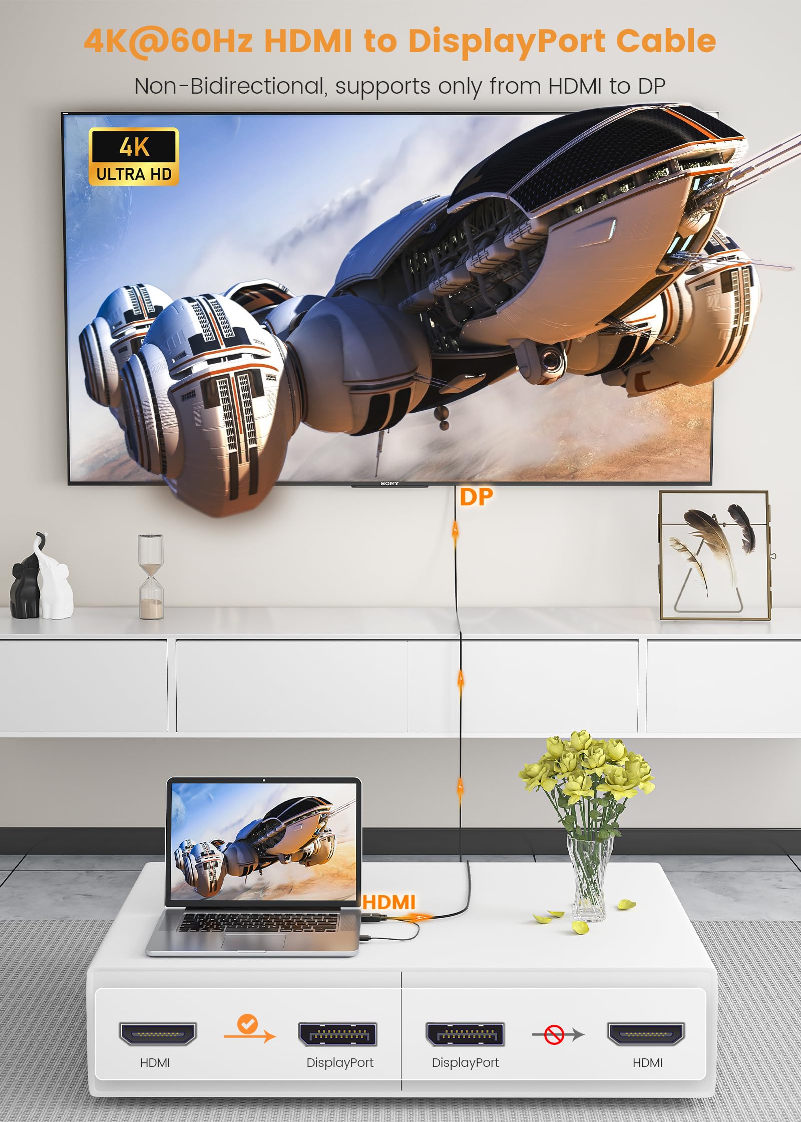 【4K@60Hz HDMI to DisplayPort Cable】 HDMI to DP transfer signal from HDMI output source devices to DP input monitor, supports resolution up to 4K (3840 x 2160)@60Hz, 4K@30Hz,1440P@60Hz, 1080P@60Hz. *Note: to get corresponding resolution rate, your PC/laptop and monitor must support the resolution both.