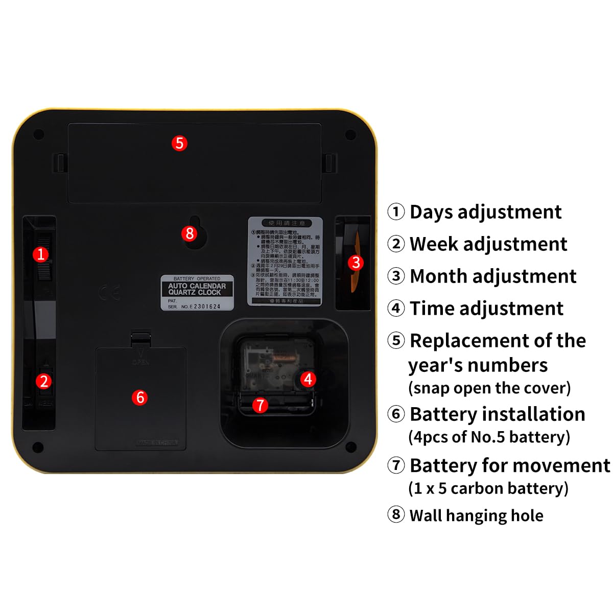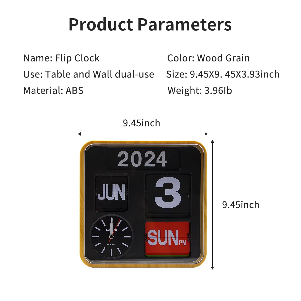 Note£º Rattle when turning pages: the flip clock will have a slight rattle when turning pages, which is a normal phenomenon. Each turn of the page is full of ceremony, do not shoot if you mind! How to hang on the wall: There is a hole on the back of the clock, you can hang the clock on the wall through the hook. Size:9.45X9. 45X3.93inch Material: ABS + Acrylic Extra large display of year, month, date and day. The month, date and day of the week will flip when time passes. Simply rotate the hands for installation and pre-testing. A very unique wall clock for office, business or home. Battery installation:4pcs of No.5 battery Battery for movement:1pcs of No.5 carbon battery Time adjustment:Please refer to the picture for detailed time adjustment knobs About the digital blade shedding problem With this type of flip clock, because the blades are stuck on the spindle, the numbers had fallen out of the clock during transportation due to drops and impacts. The blades are free to be removed and installed, so simply inserting the two corners on the digital blades into the corresponding holes will solve the problem. (If the digital page blades fall off or other reasons cause the digital page blades can not work properly, please contact us and we will send you a new digital blade as a replacement.)