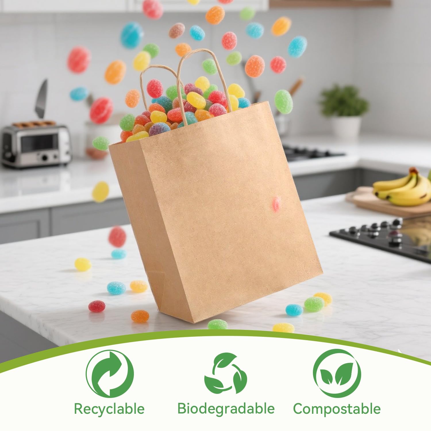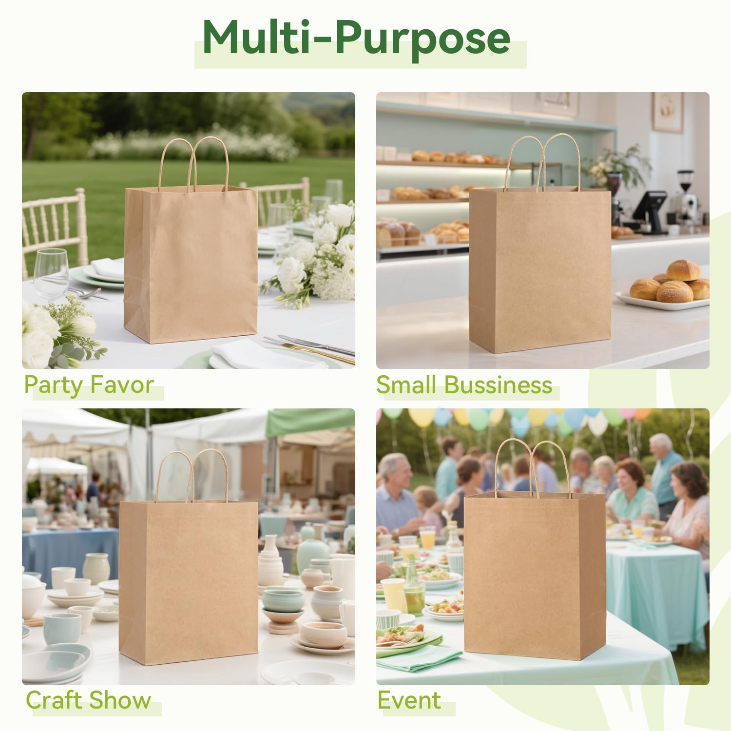 [Paper bags - 100pcs]: These medium brown paper bags with handles bulk are 8x4.76x10" in size, which makes them perfect for anyone selling crafts. You can use them to bag various small and medium-sized craft items or lightweight artworks, such as homemade confections, cookies, pickles, jam, soap and more. They are also ideal for products at fairs and farmers' markets. Additionally, they work perfectly for To-Go orders or as shopping bags for customers without fear of breaking.