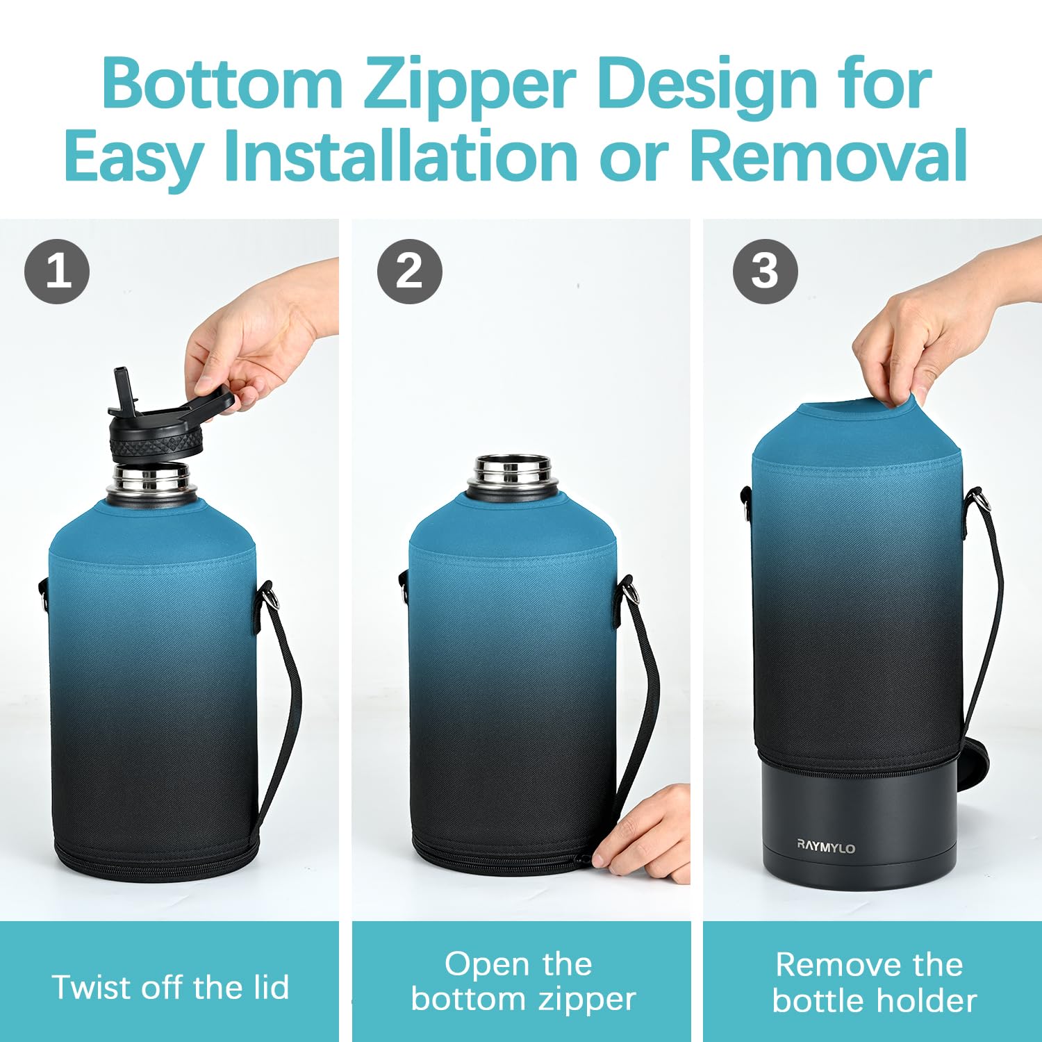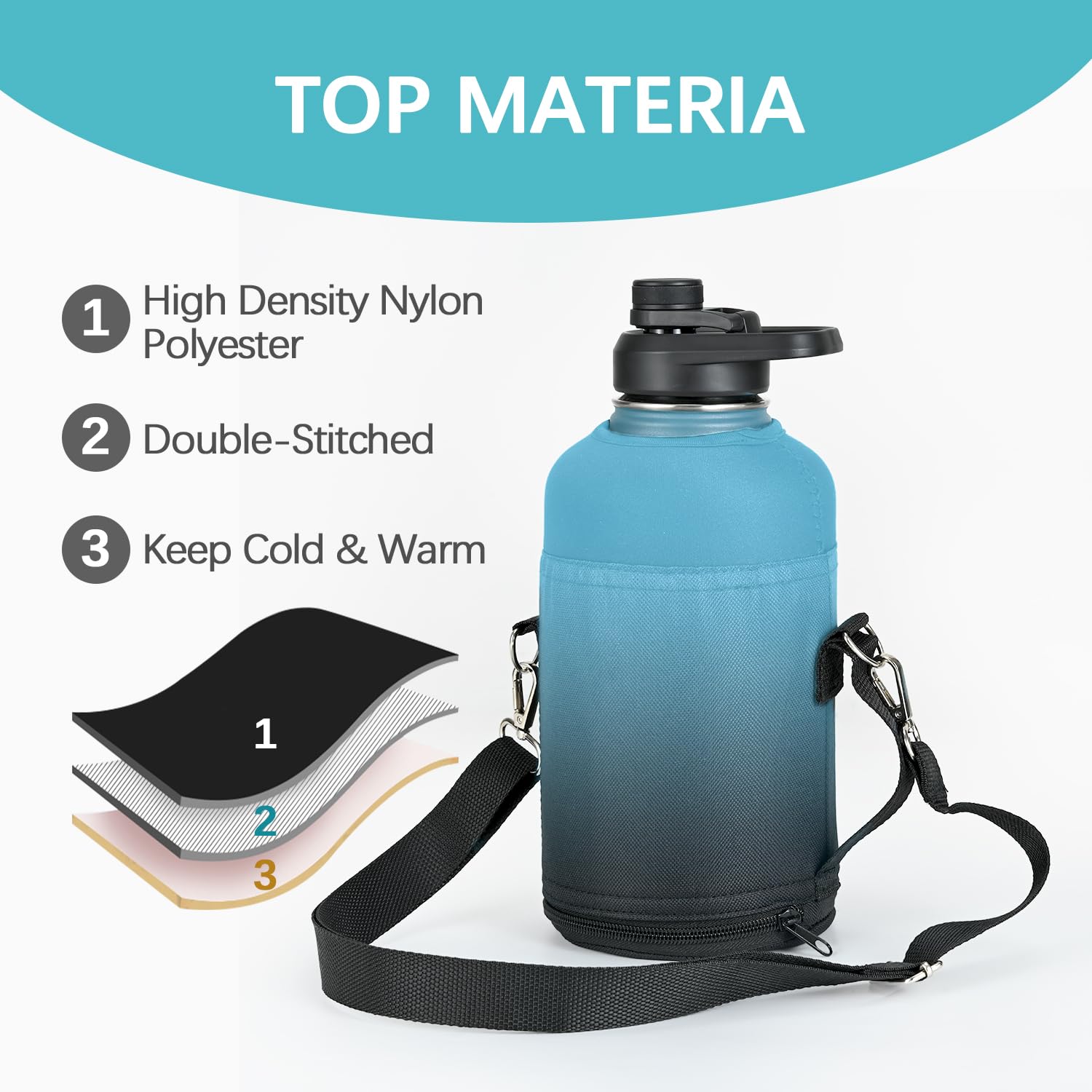 RAYMYLO Water Bottle Holder for 64/128 oz Bottles with an Adjustable Padded Shoulder Strap - Made of High Density Nylon Polyester, Carry, Protect and Insulate Your Flask What You Get: 1 x RAYMYLO Water Bottle Holder 1 x Adjustable Padded Shoulder Strap. 7 x 24H Online Continuous After-sales Service Please Note that the Maximum Size of Suitable Water Bottle is: Height: 9.84”(25 cm) Bottom Diameter: 4.92”(12.5 cm)