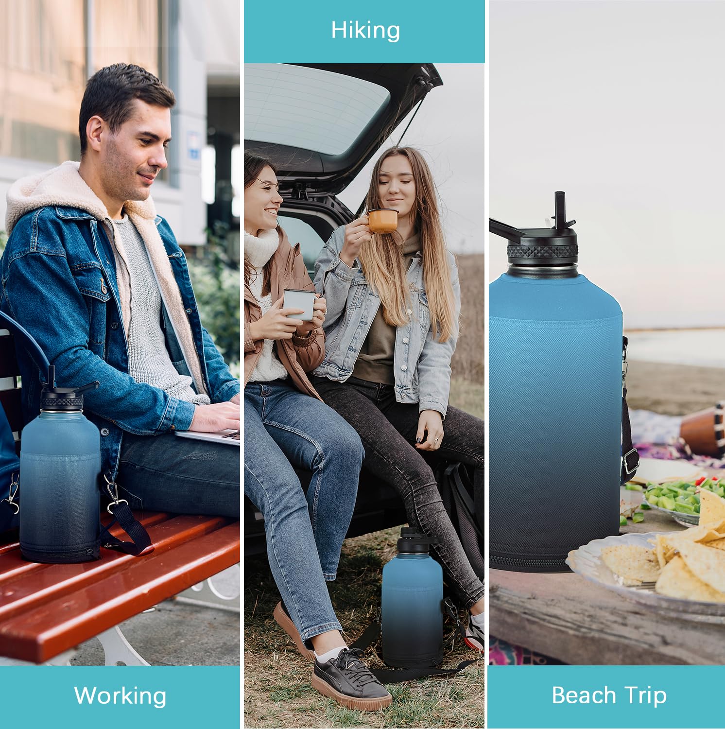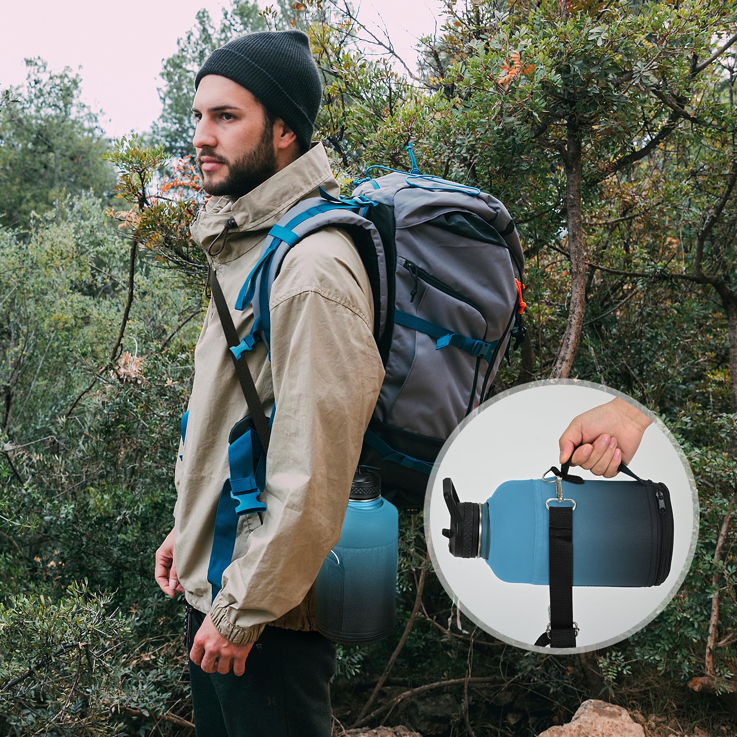 STRONG MATERIAL AND INSULATED INSIDE: Our water bottle holder is made of high-quality and water-resistant fabric, protect your water bottle from scratches or loss.Plus, the insulated interior keeps your drinks at the ideal temperature, whether it's warm or cold.