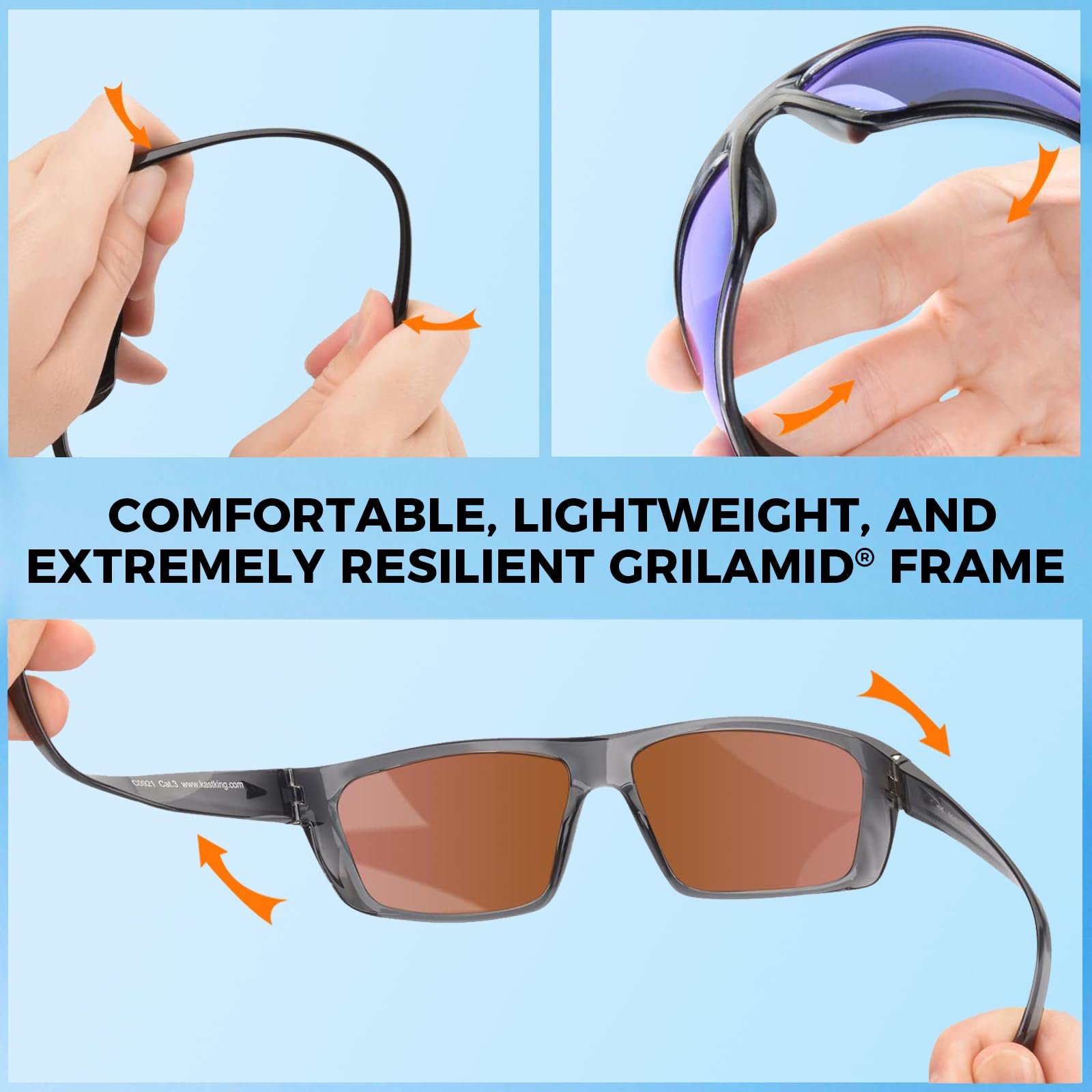 SUPERIOR FRAMES – Made from the same Grilamid material commonly used by the military and in medical applications, our frames are lightweight, extremely flexible, and heat and UV resistant. Grilamid frames are well known for their strength, lightweight comfort, shape integrity, and impact resistance. This ultra-lightweight and malleable material translates to a very comfortable fit.