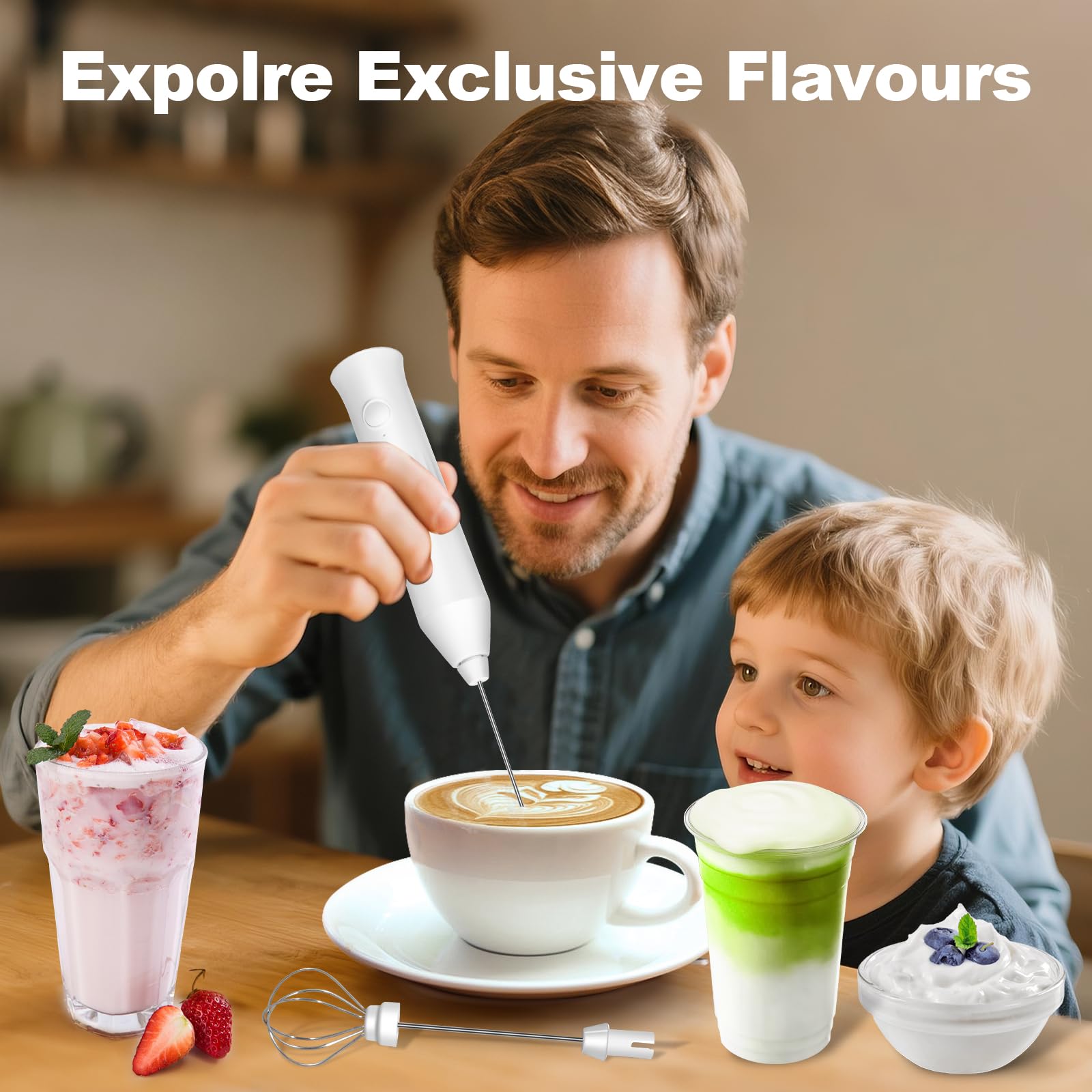 【Detachable & Portable】Features a detachable handle, lightweight body, and two interchangeable beaters (spring whisk and balloon whisk). Simply remove one head and snap on the other for easy switching. Its compact size fits neatly in kitchen drawers, camping gear, or suitcases—perfect for frothing anywhere.