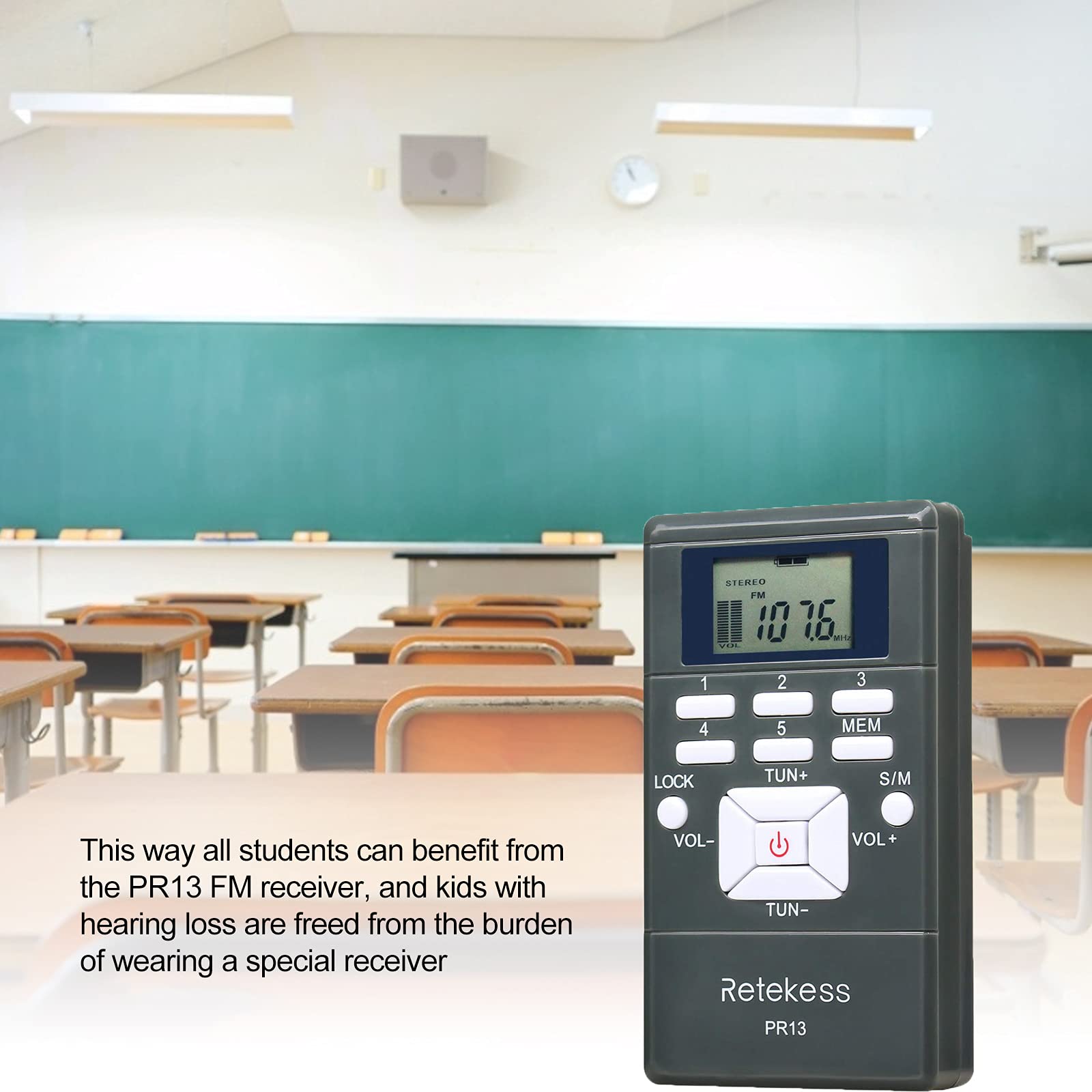 The portable PR13 FM receiver measures 3.6 x 2.1 x 0.6 inches and weighs 0.09 pounds; it fits easily in your pocket; or you can hang it around your neck with the included lanyard to free your hands