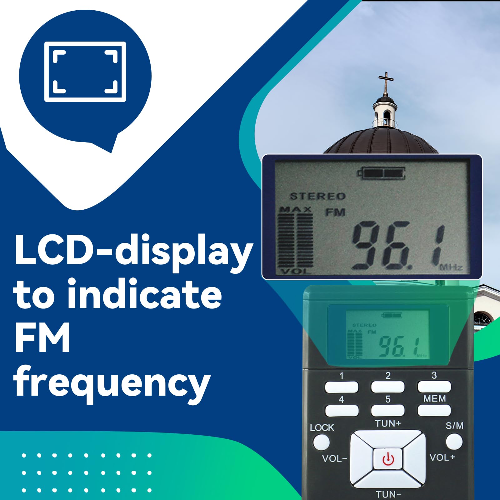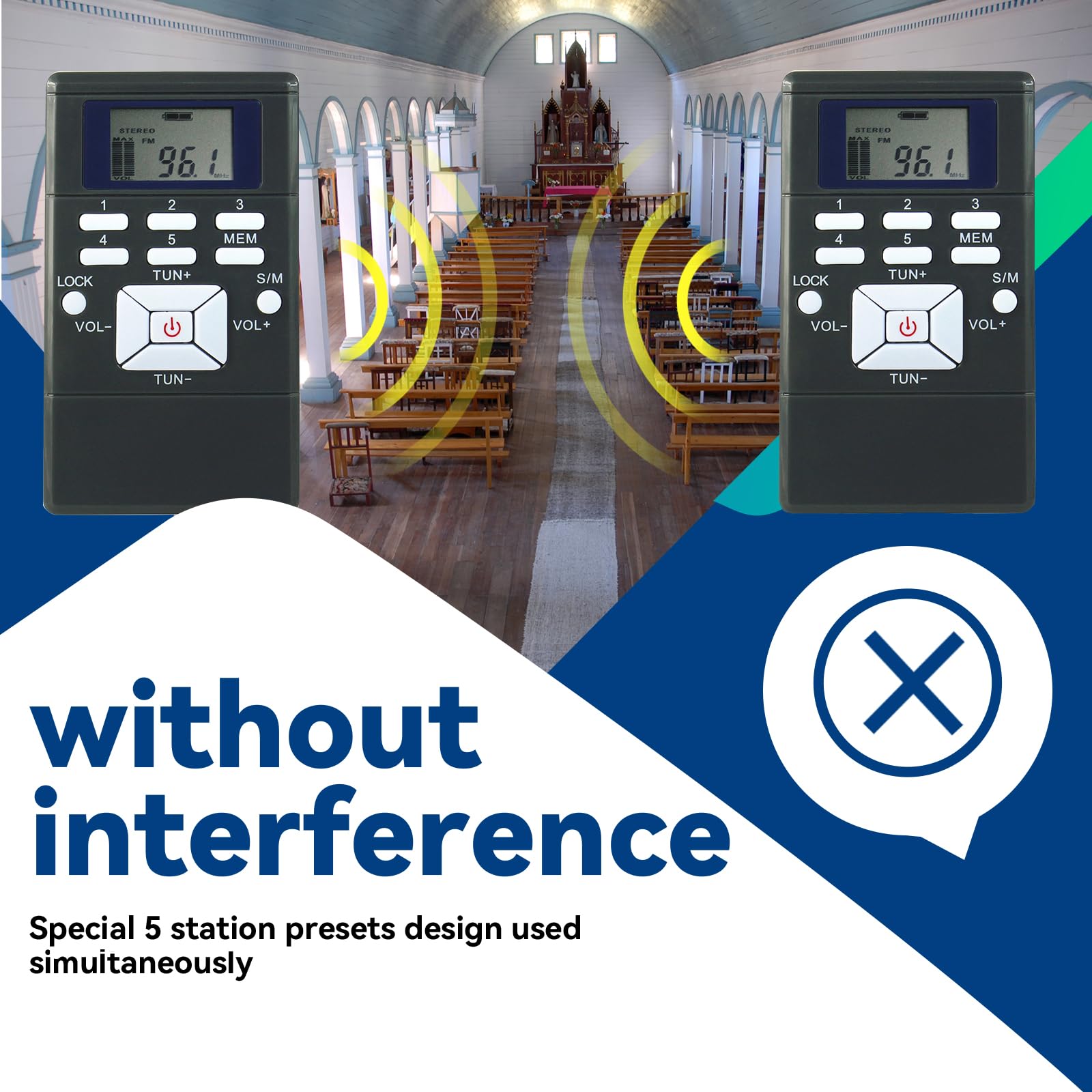 With earphone for better listening environment; lock switch to prevent accidental operation; portable fm reciever works with FM transmitter; countless receivers can be added to a single transmitter