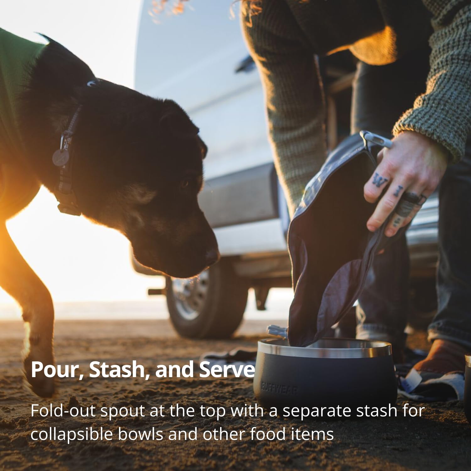 EASY POUR, LESS MESS. Top spout lets you pour kibble straight into bowls without spills. Roll-down closure secures food and adjusts capacity, perfect for dogs, puppies, and outdoor adventures.
