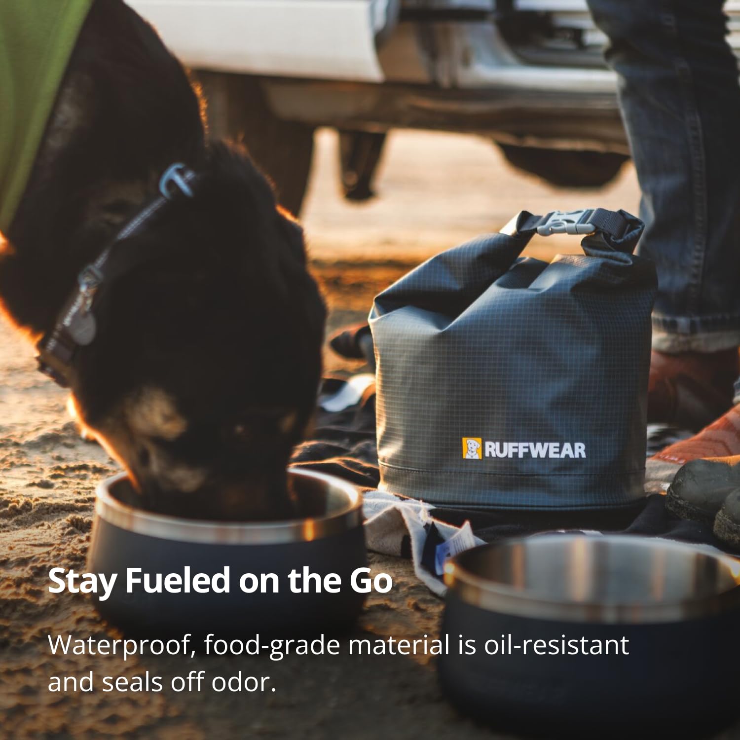 ADVENTURE-READY FOOD BAG. Travel-friendly bag keeps kibble fresh, odor-free, and pest-free with waterproof, food-grade liner, roll-down closure, and adjustable volume for trips big or small.