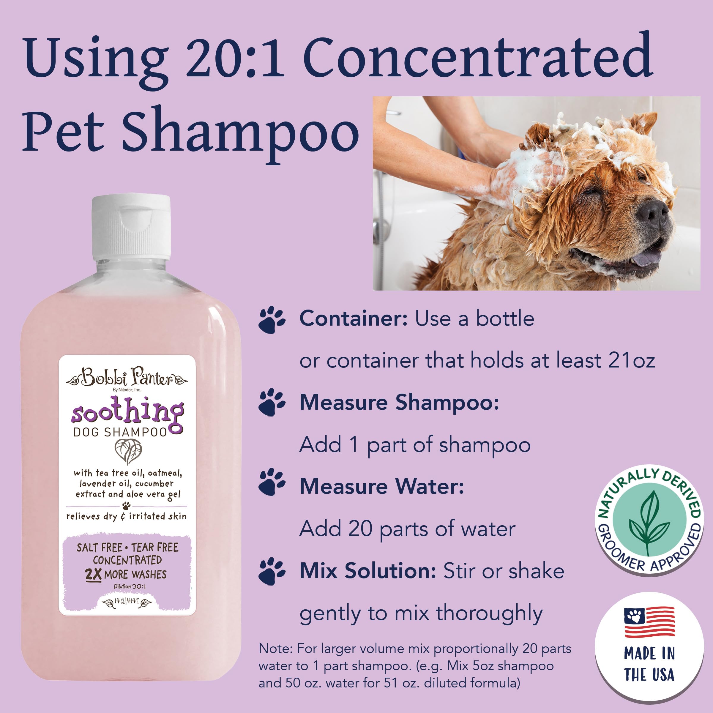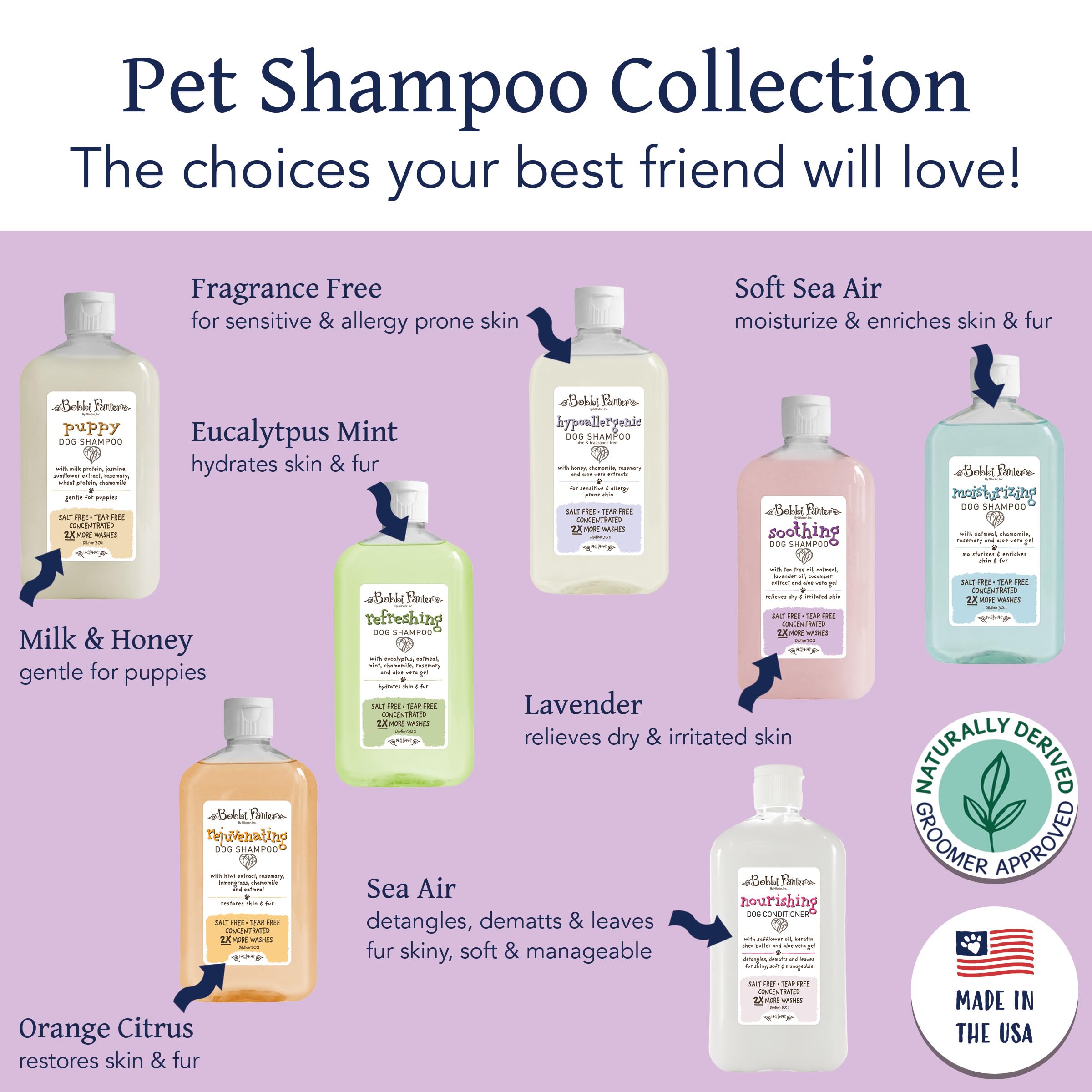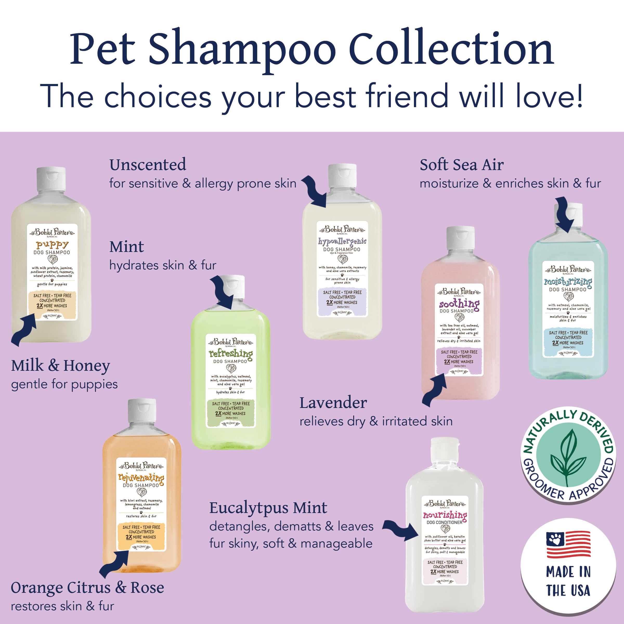 USED BY PROFESSIONAL GROOMERS WORLDWIDE: Renowned for their all-natural ingredients and MADE IN THE USA, Bobbi Panter products are the top choice for professional groomers around the world. The salt-free, natural ingredients in Bobbi’s concentrated formulas solve problems and deliver highly effective results making them indispensable in the pet care industry. Bulk cases are readily available for high-volume needs.