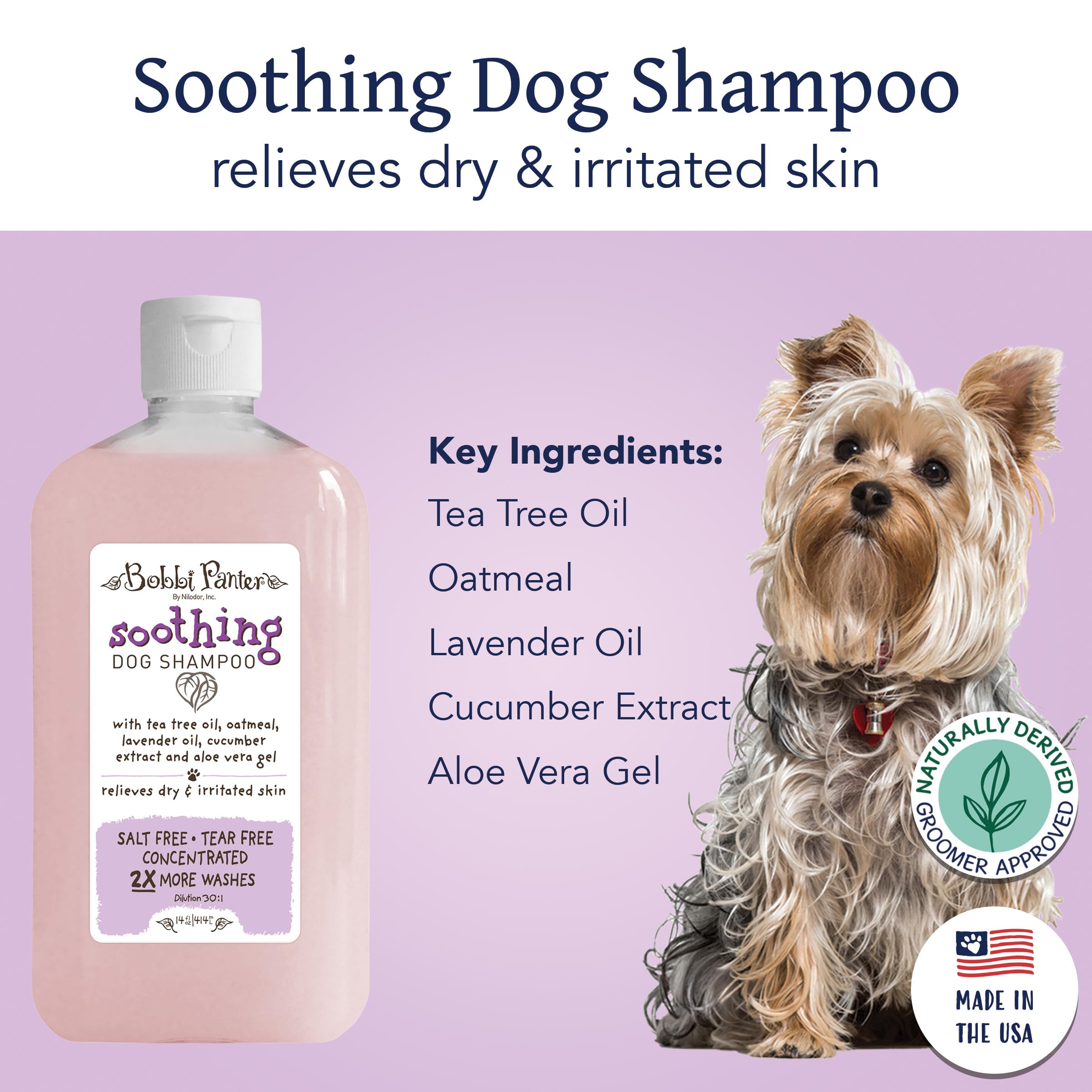 Bobbi Panter Natural Soothing Shampoo soothes dry skin and fur with Lavender Oil, Tea Tree Oil, Oatmeal, Cucumber Extract and Aloe Vera Gel. A relaxing lavender scent. Bobbi Panter created Bobbi Panter Pet Products out of love for her own dog, Bobo. Natural ingredients. Salt free, tear free and solves specific skin and coat problems. High in essential oils that actually penetrate the skin and fur. Rinses fast-dries fast. Won't wash off topical flea treatments. Safe for cats, puppies & kittens of all ages.