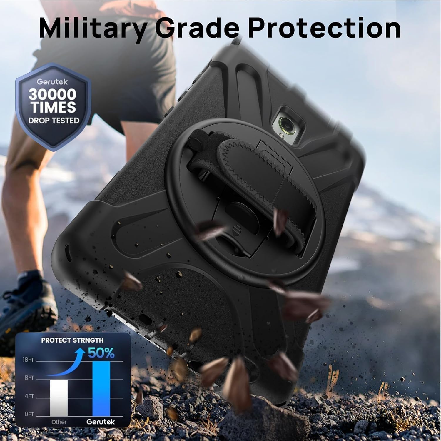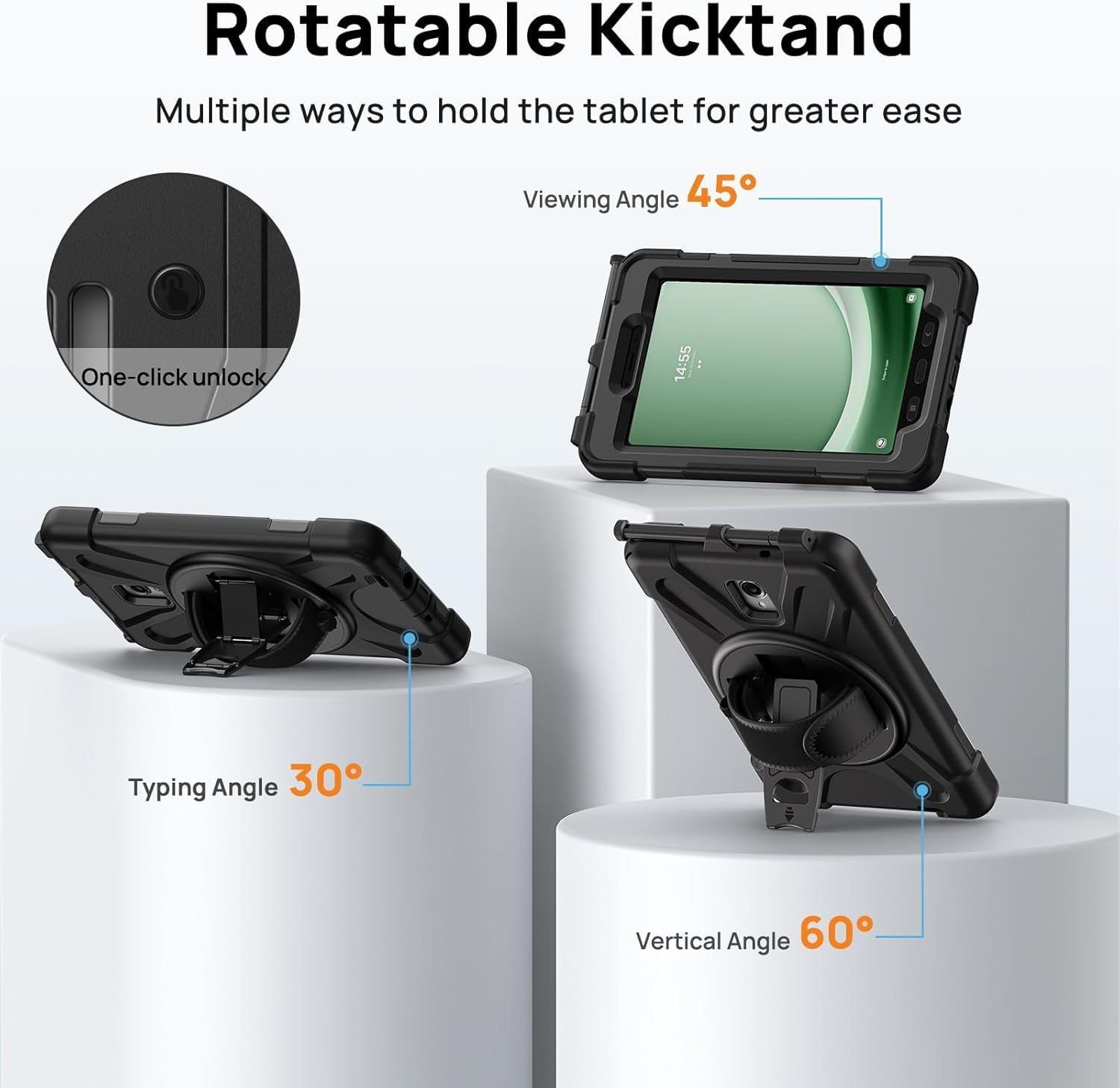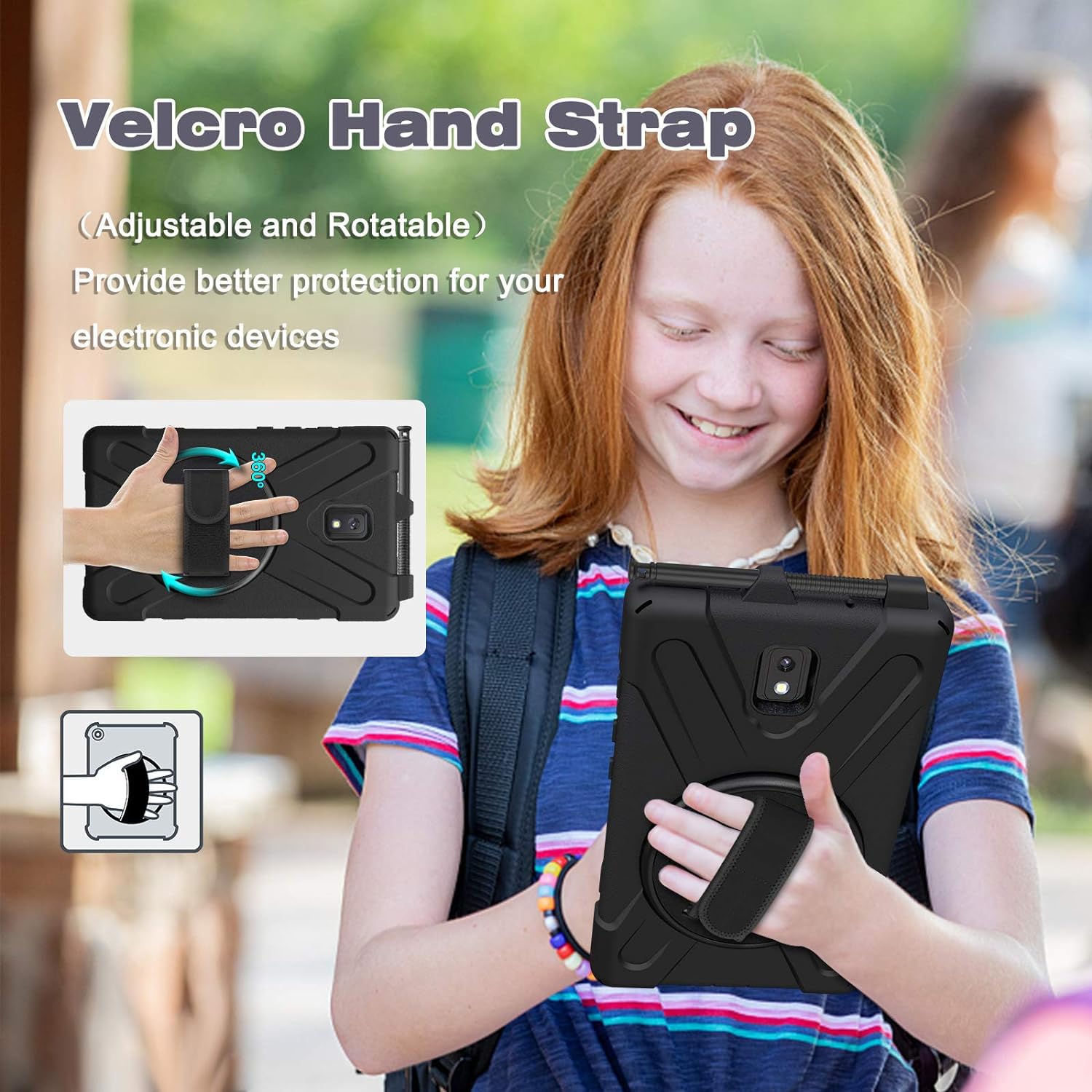 With a rotatable and adjustable handle hand strap, easier to use your tablet with one single hand in your outdoor traveling, working, and gaming with kids