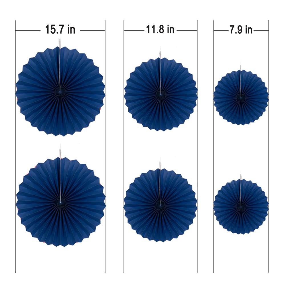 Royal Blue Paper Fans Decoration 6pc craft blue paper fans on both sides of paper, 3 different sizes measuring 15.7'' /11.8'' / 7.9'' in diameter