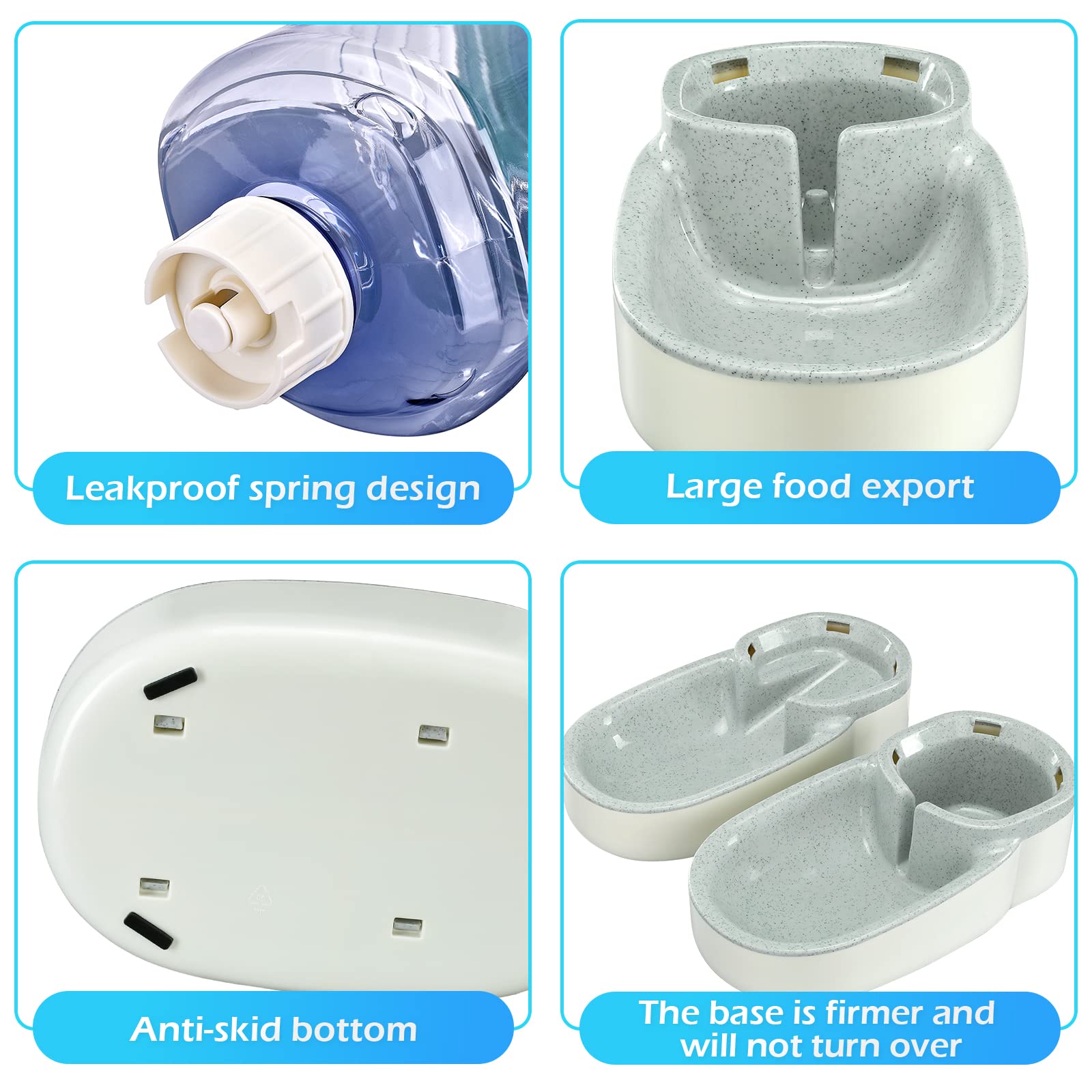 Cat Feeder Novel Design: The water dispenser adopts spiral and spring valve design to ensure that it never leaks. With a transparent storage bottle, you can refill it in time when the food and water are used up.