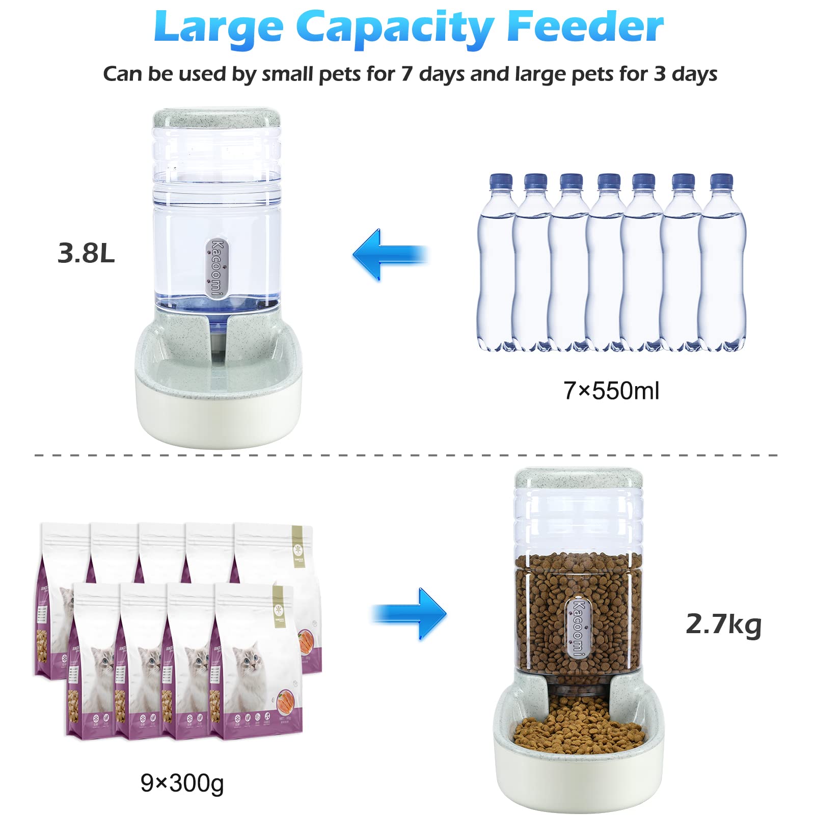 Large Capacity Pet Feeder: large capacity 3.8L, can last about 7days for small pets, 3 days for big pets. You can rest assured to go to vacation, work, party, don't worry that pets will be hungry. The folding bowl can solve the feeding problem when you take your pets out.