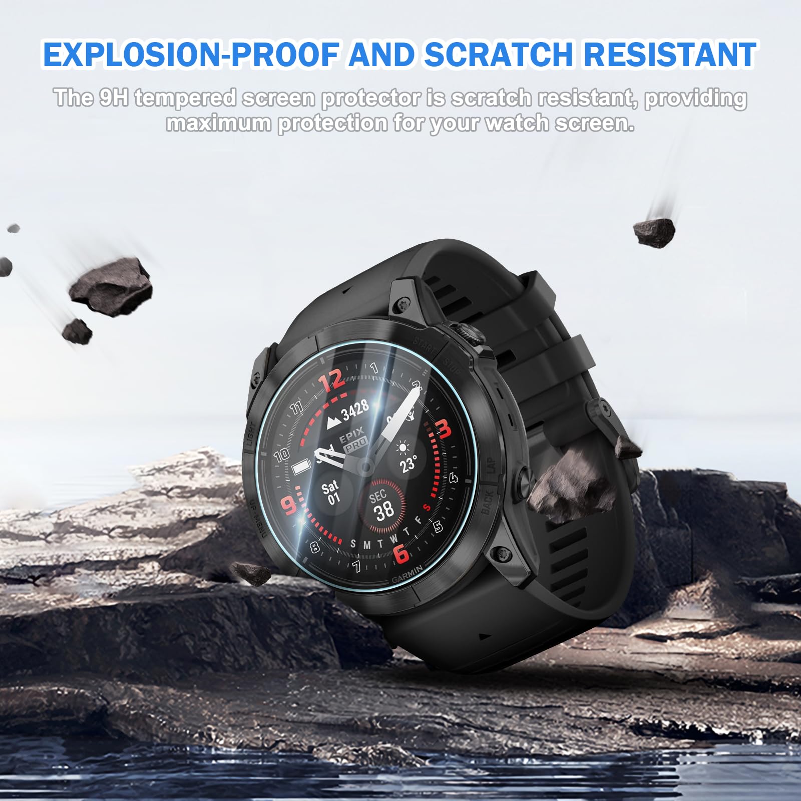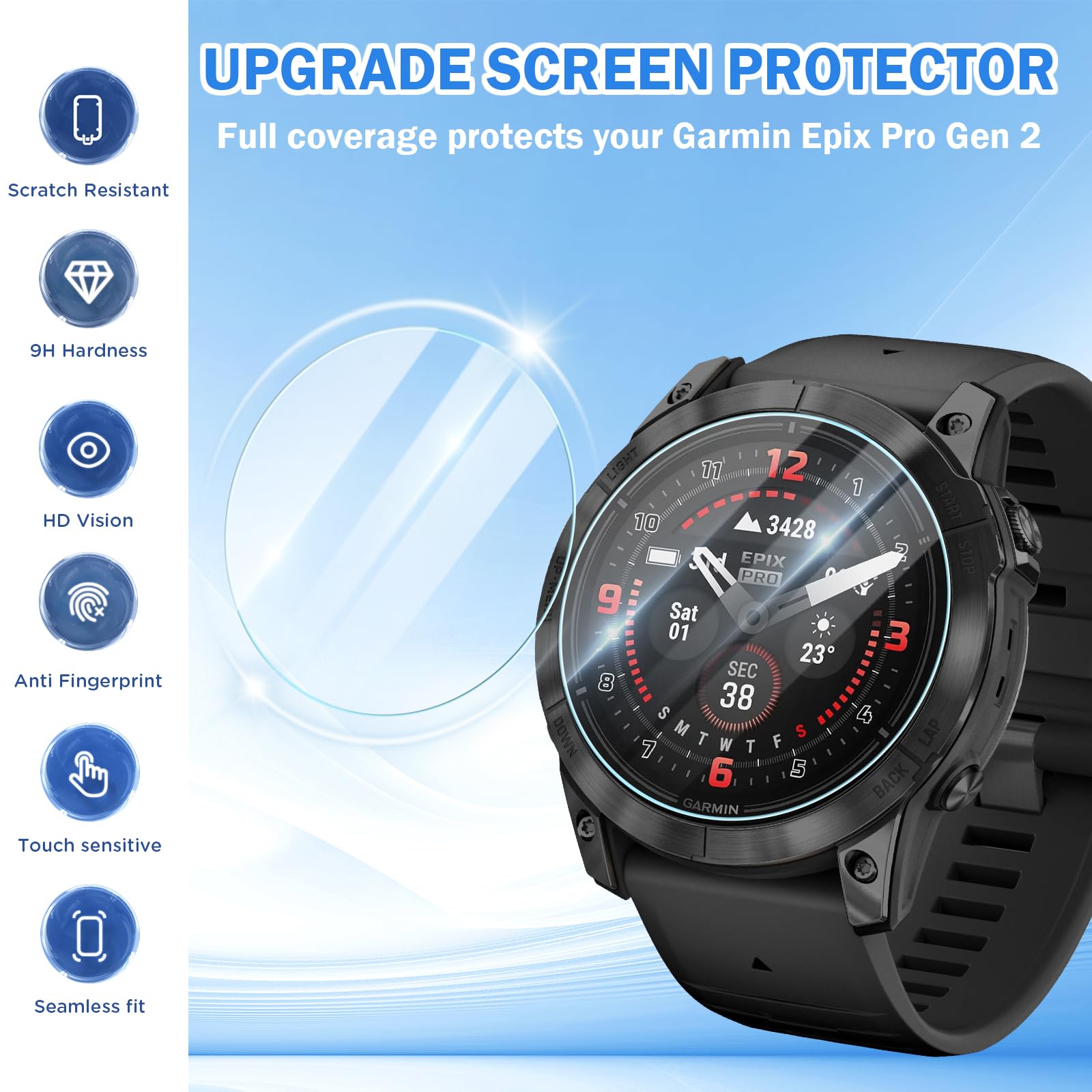 [Premium material] The Garmin Epix Pro Gen 2 smartwatch screen protector is made of 9H tempered glass, the hardness is greatly enhanced. And the smooth surface make it easy to clean, especially to avoid the adhesion of oil stains and fingerprints, maintaining a clean appearance of the watch screen