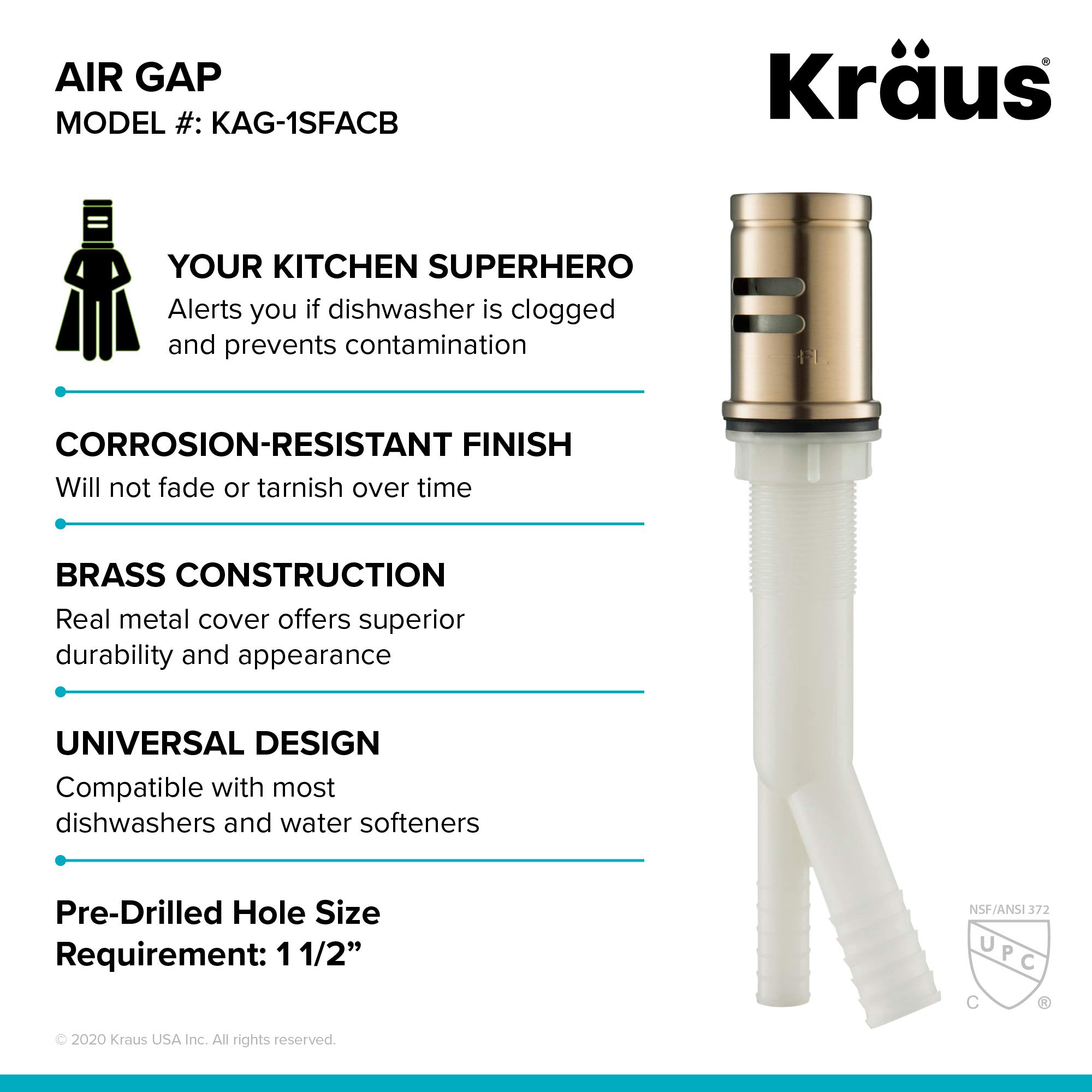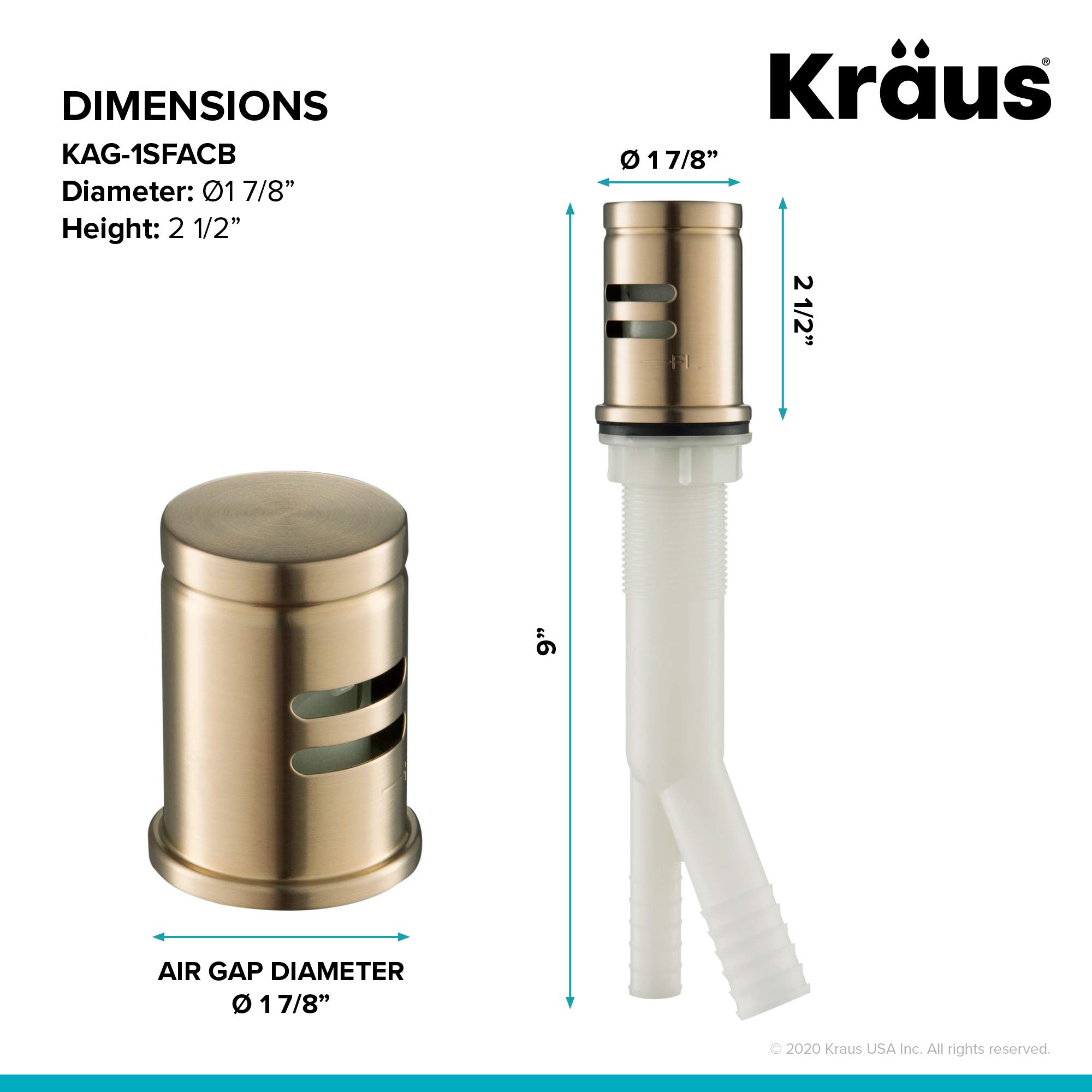 Keep your dishwasher free from contamination with the KRAUS Air Gap kit. Required by plumbing codes in many states, an air gap is the best way to prevent your dishwasher from being flooded with dirty water. This kit includes an air gap body made of durable ABS plastic and a solid brass cap built for maximum durability with a high-end feel. The cover installs flush to the sink deck or countertop, creating a clean look. The cover comes in a variety of corrosion-resistant finishes to match your kitchen faucet. Detailed instructions are included for easy installation and worry-free use. From the Manufacturer With a long history of manufacturing exceptional kitchen and bathroom products, we at KRAUS believe in the power of design to transform ordinary environments into beautiful spaces. Our goal is to deliver the highest value possible for our customers, providing innovative fixtures at approachable prices. We want to empower consumers, allowing them to transform their homes with intuitive designs and easy-to install products that are built for a lifetime of use. We strive to continuously raise the bar in terms of quality, function, and design. Transform your kitchen and bath with KRAUS, and experience Innovation for Real Life.