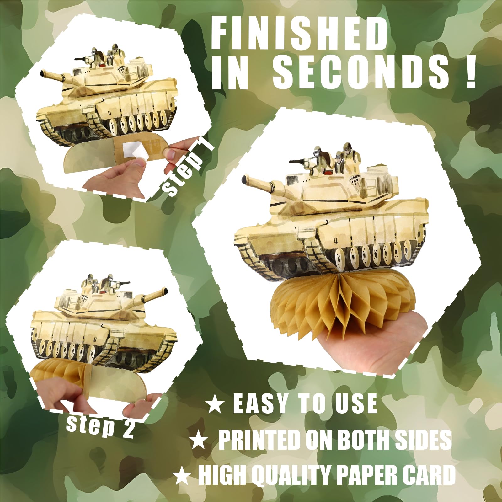 EASY TO ASSEMBLE: Set up your party in minutes with these simple-to-use army table toppers. Just attach the honeycomb to the card, fold out the feet of the little tanks, and place them in your chosen display area. Decorating your party has never been easier or quicker!