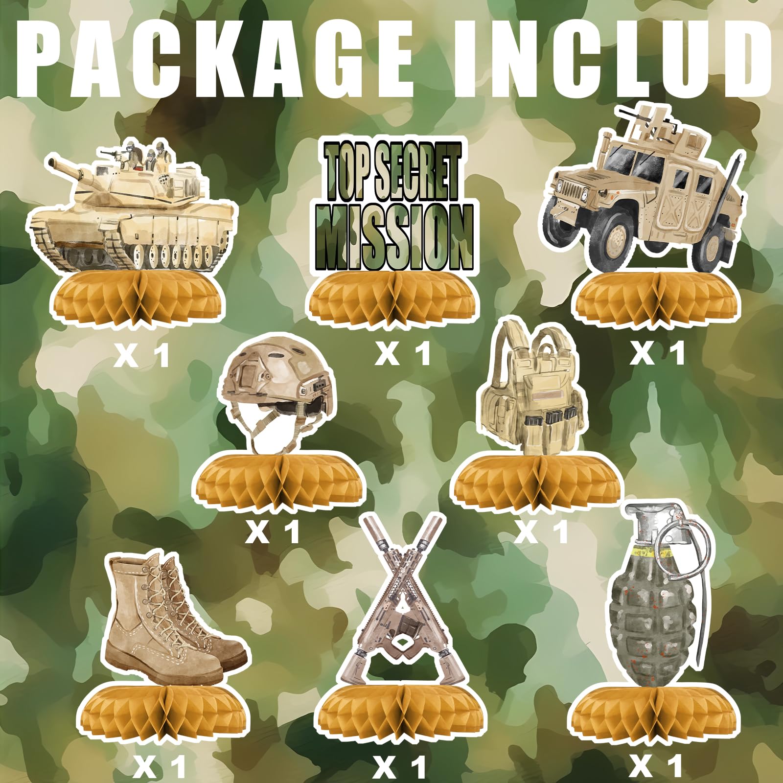 COMPLETE SET INCLUDES: This set includes 8 camouflage army table toppers, along with tank and tree models. Combine with other army-themed decorations to make your party a roaring success!