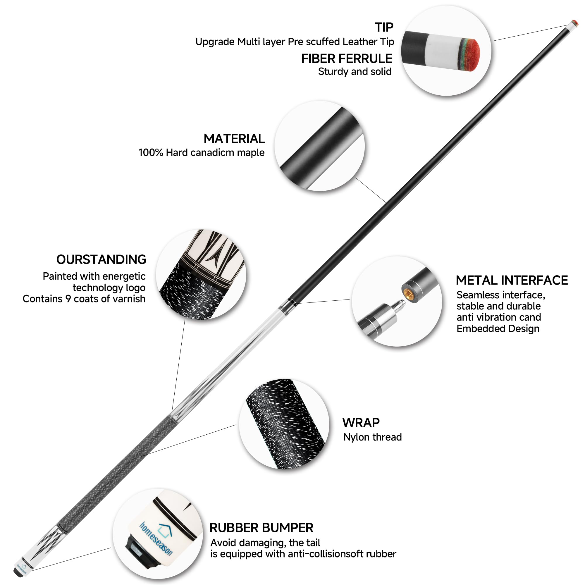 [Premium Material]: Pool cue are made of maple wood, finished with matte paint. Features a two-piece pool cue stick design for easy transport and storage.