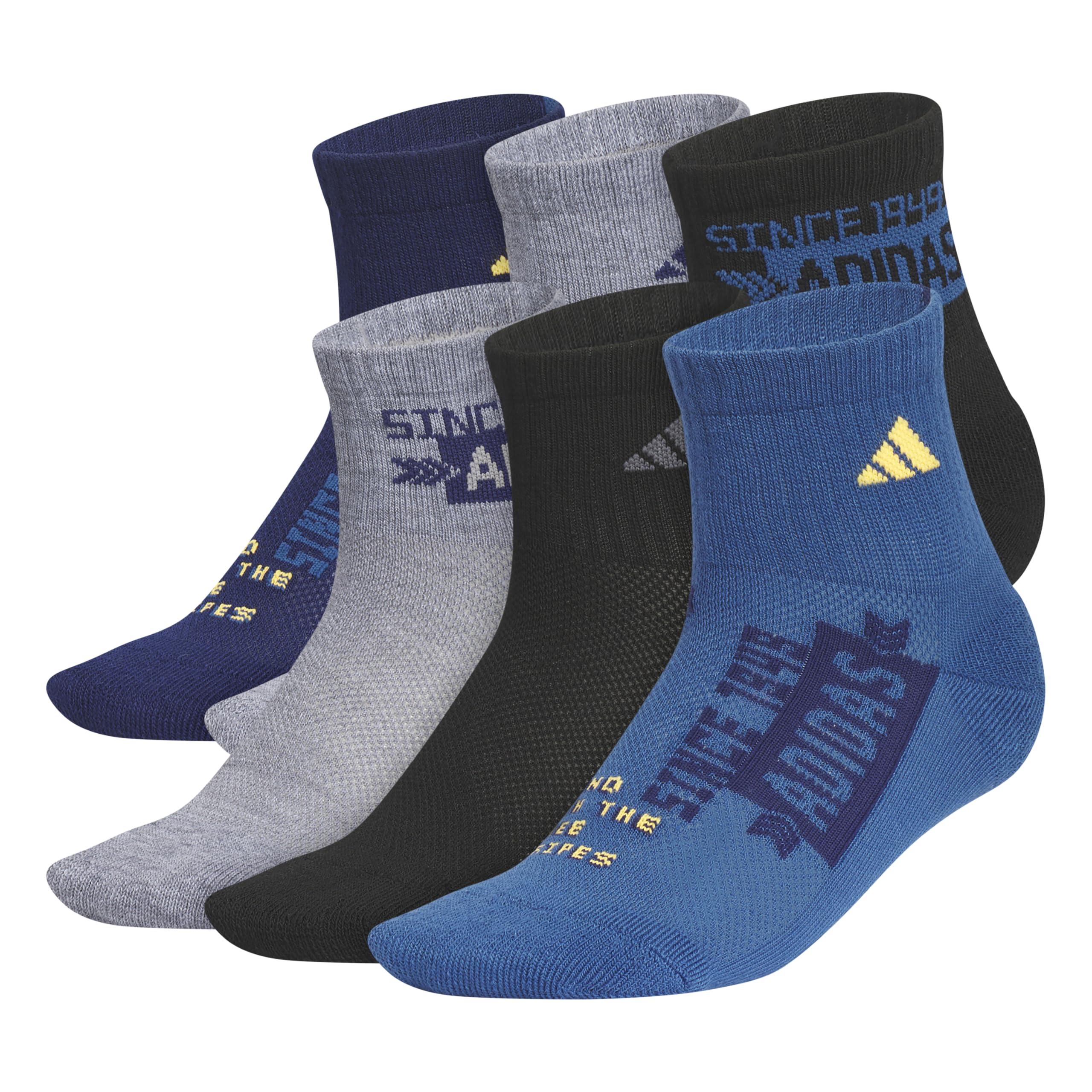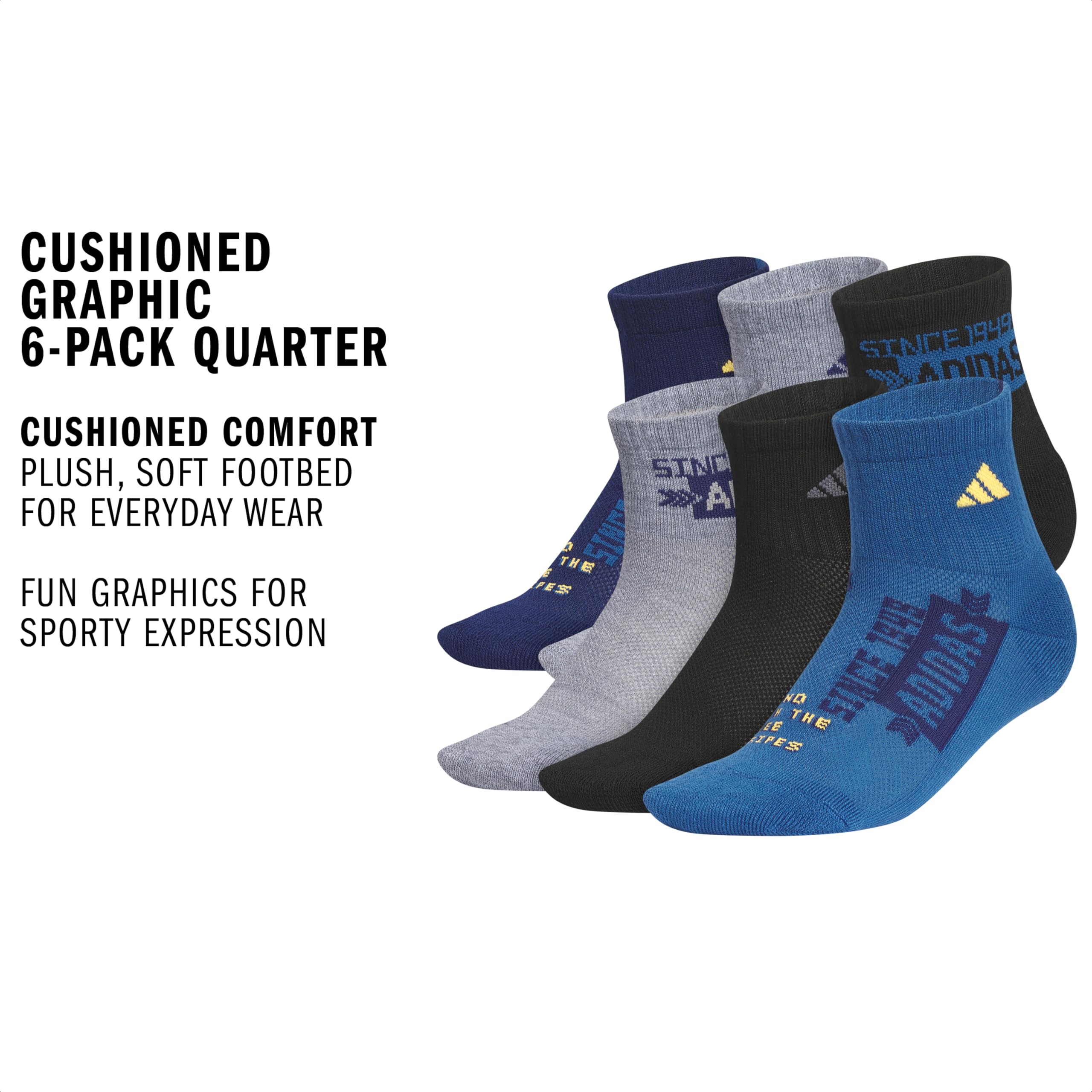 Description Shoes get all the glory, but it's socks that do the dirty work. The Cushioned Graphic 6-Pack Quarter Socks for juniors are built with adidas CLIMACOOL tech to help feet stay cool and dry from the first rep to the last step. They have knit-in cushioning and stretch for a snug fit throughout.