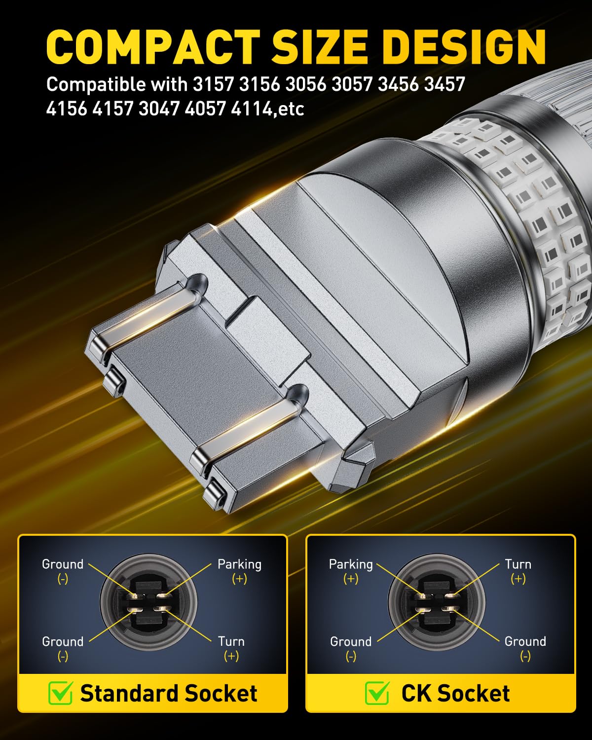 5 Mins Easy Installation: Non-polarity design fits US standard and CK sockets, perfectly fits 3157, 3157R, 3156, 3156R, 3057, 3057R, 4157, 4157R, 4156, 4156R, 3757, 3757R, 3457, 3457R, 3047, 3057R, 4057, 4057R, 4114, 4114R socket types. Suitable for car tail lights, brake lights, stop lights, backup lights, reverse lights, turn signal lights, parking lights, daytime running lights, and so on. Even beginners can finish installation in 5 minutes by directly replacing the original halogen bulb. (Please confirm your car’s bulb model before purchasing).