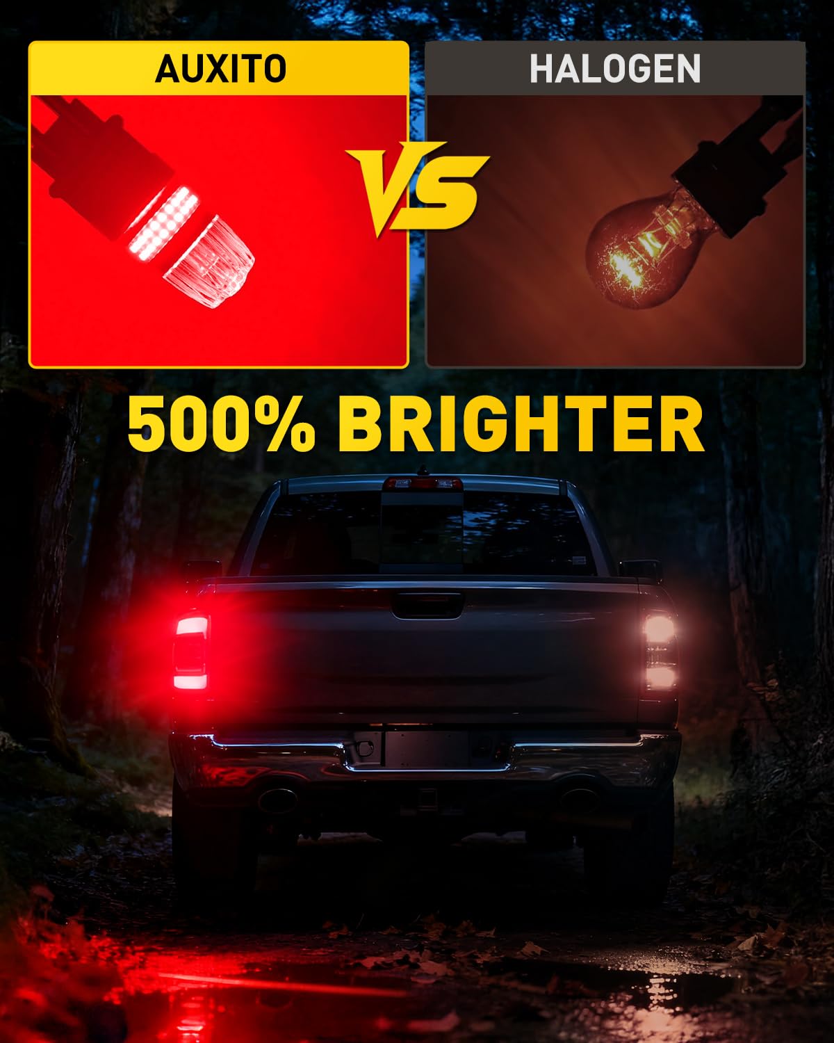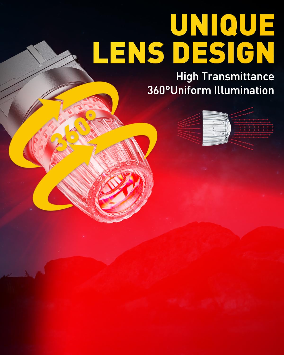Unique Lens Cover Design: Unlike most red 3157 LED bulbs without lenses, this product features a custom optical lens with a high light transmittance of 95%, ensuring full and even light distribution. The lens diffuses harsh red light into a soft and eye-catching glow, preventing glare to following vehicles from direct strong light. It not only guarantees clear and intuitive warning signals but also provides a comfortable visual experience for other vehicles on the road.