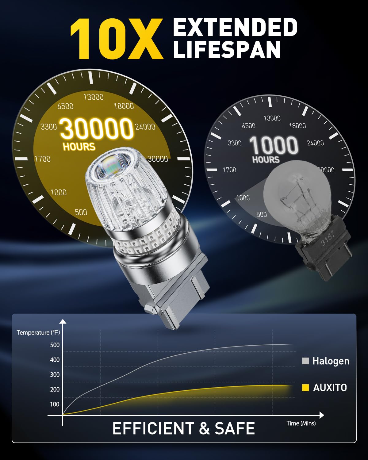 Durable & Long-Lasting: Made of aviation-grade aluminum body and scratch-resistant optical lens, accelerating heat conduction and diffusion for a significant boost in heat dissipation efficiency, preventing premature aging of LED chips caused by overheating. The service life of 3156 led red bulb is up to 30,000 hours, reducing the frequency of bulb replacement.