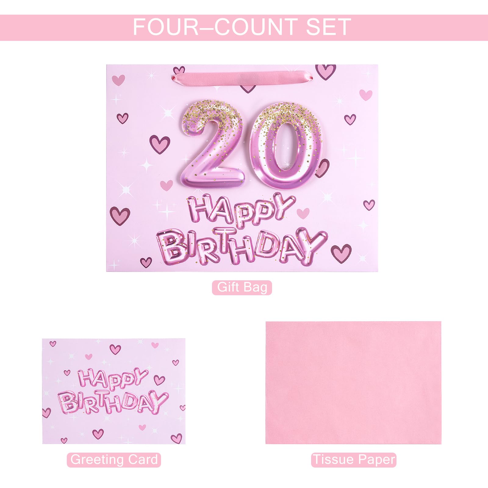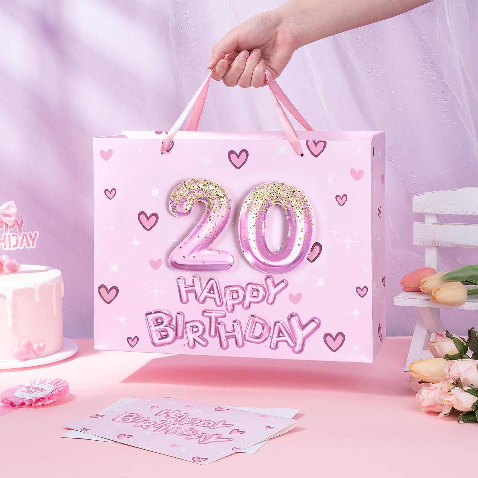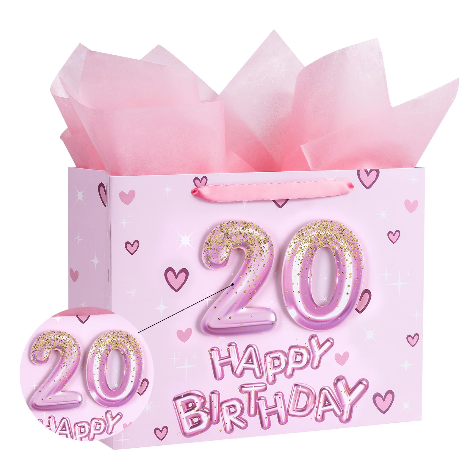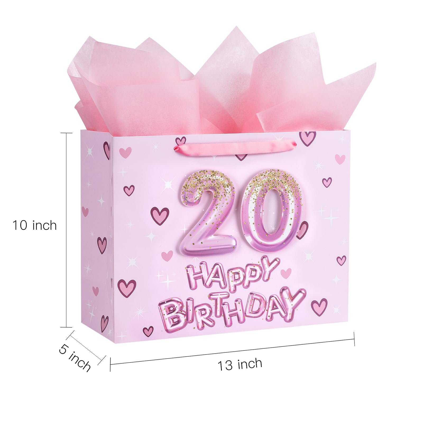 BIRTHDAY DESIGN: Gift bag printed 3D pink number 20 balloons, hearts and "HAPPY BIRTHDAY" text on pink background comes with nice ribbon handles and supportive reinforced bottom, making it perfect for girls' celebrations