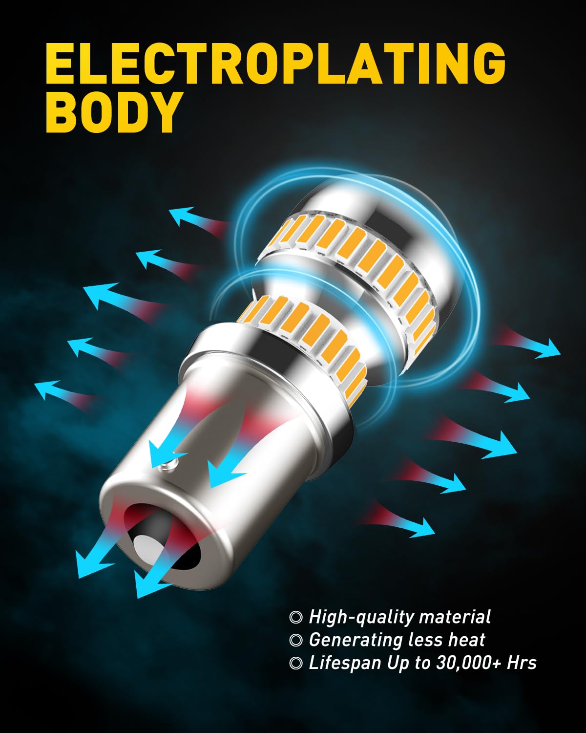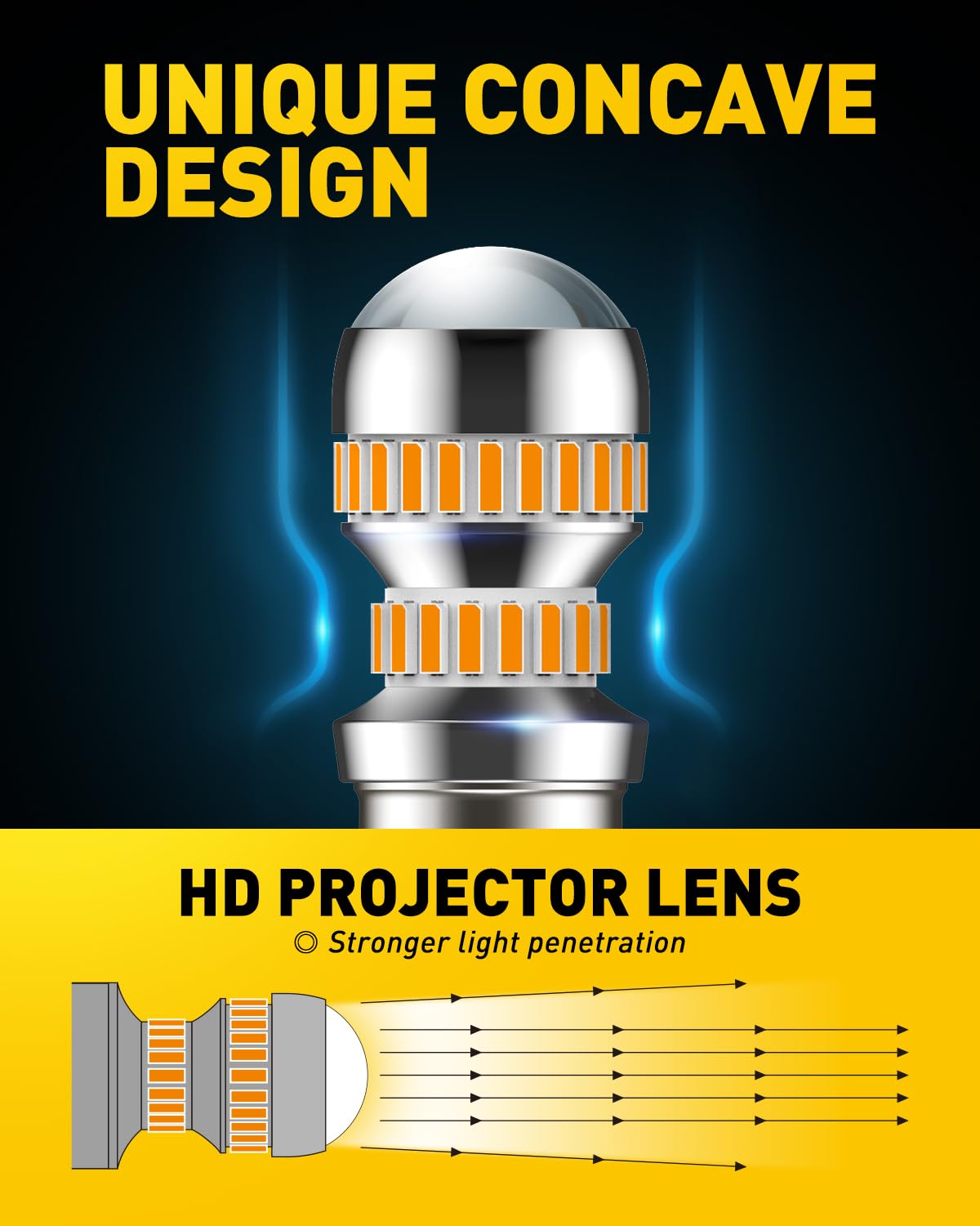 Resembling halogen bulb shape design and sequencing 54 4014-SMD LED chips precisely around the 1156 led amber bulb. Delivering 360° high luminous efficiency with full amber yellow light, see more clearly and safely when driving