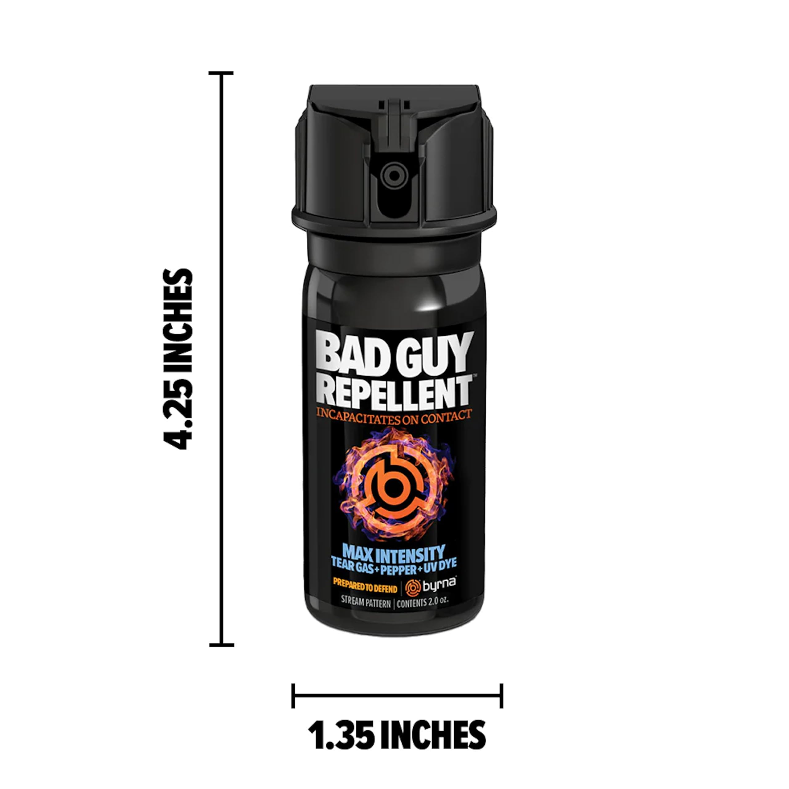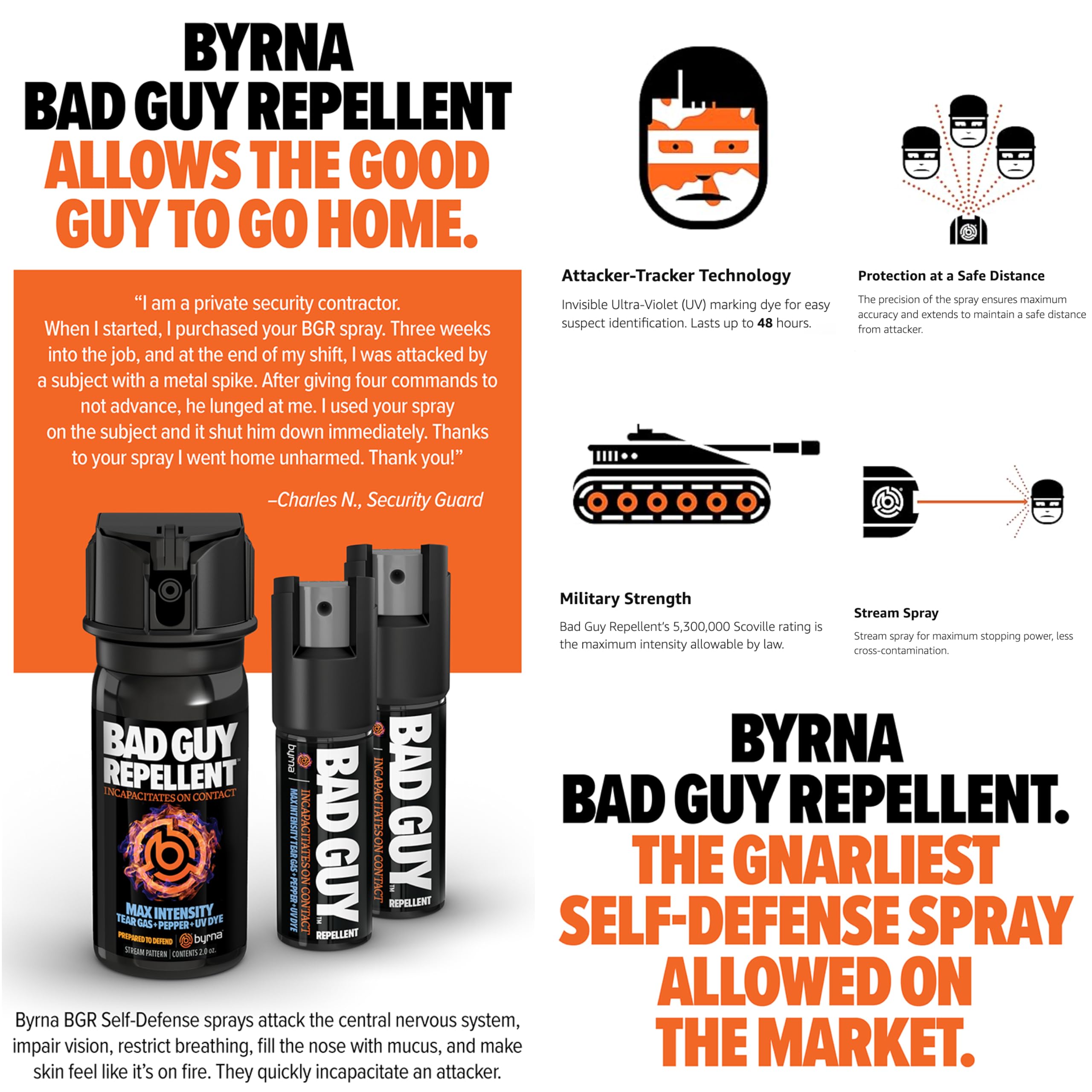 MAXIMUM STOPPING POWER: Byrna’s Bad Guy Repellent, or BGR, contains both pepper and tear gas, making it one of the most powerful chemical agent defense products on the market.Attacks the central nervous system, impairs vision, restricts breathing, and causes the nose to fill with mucus and skin to feel like it’s on fire – quickly incapacitates attacker.