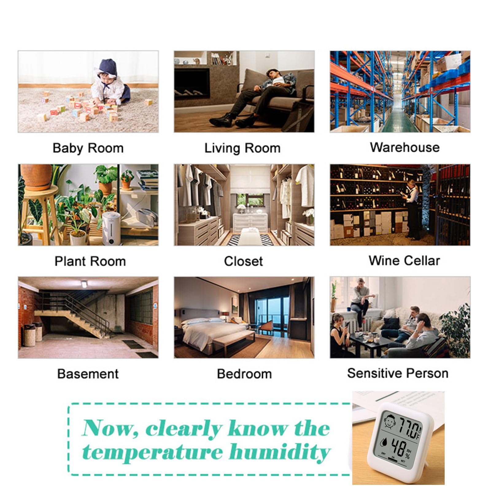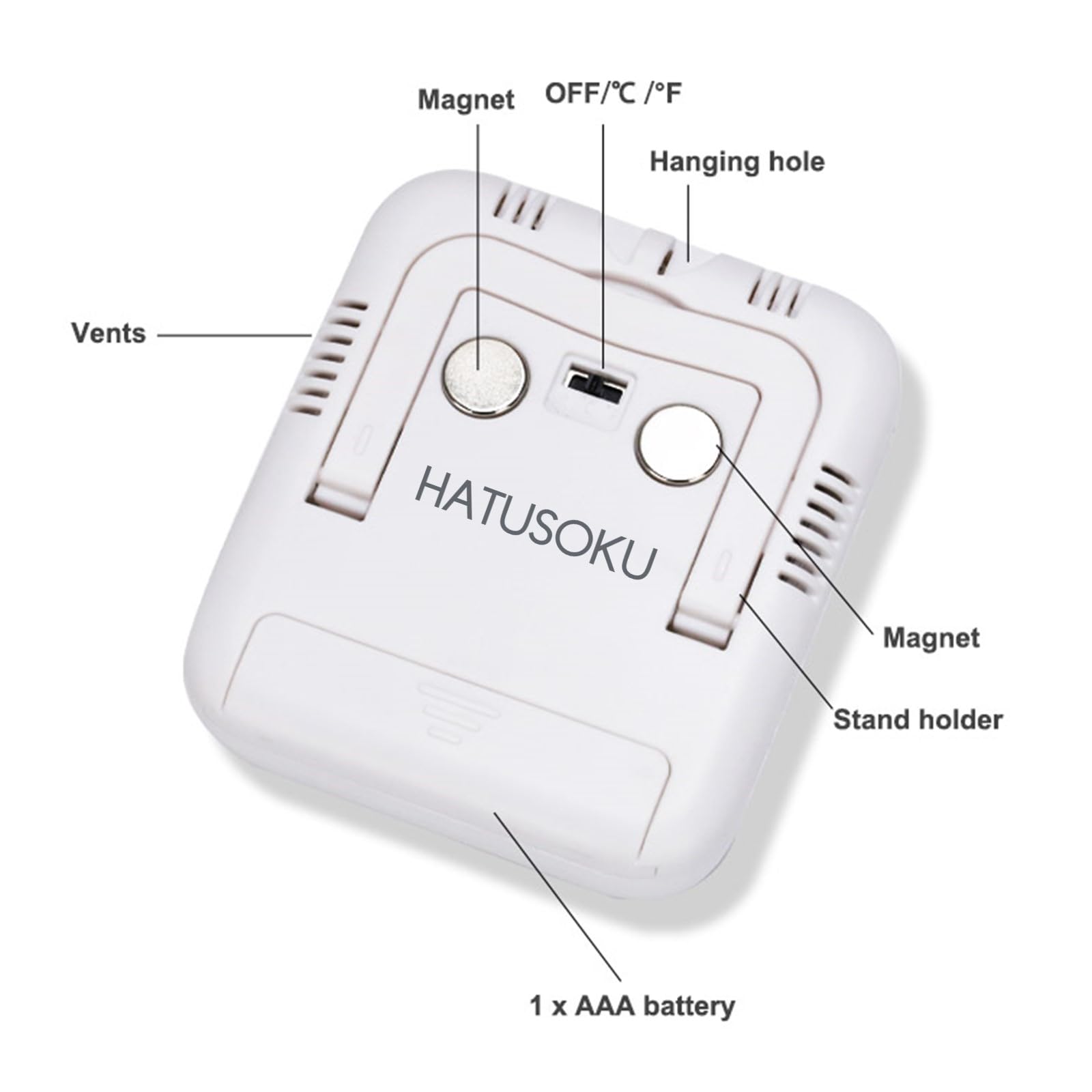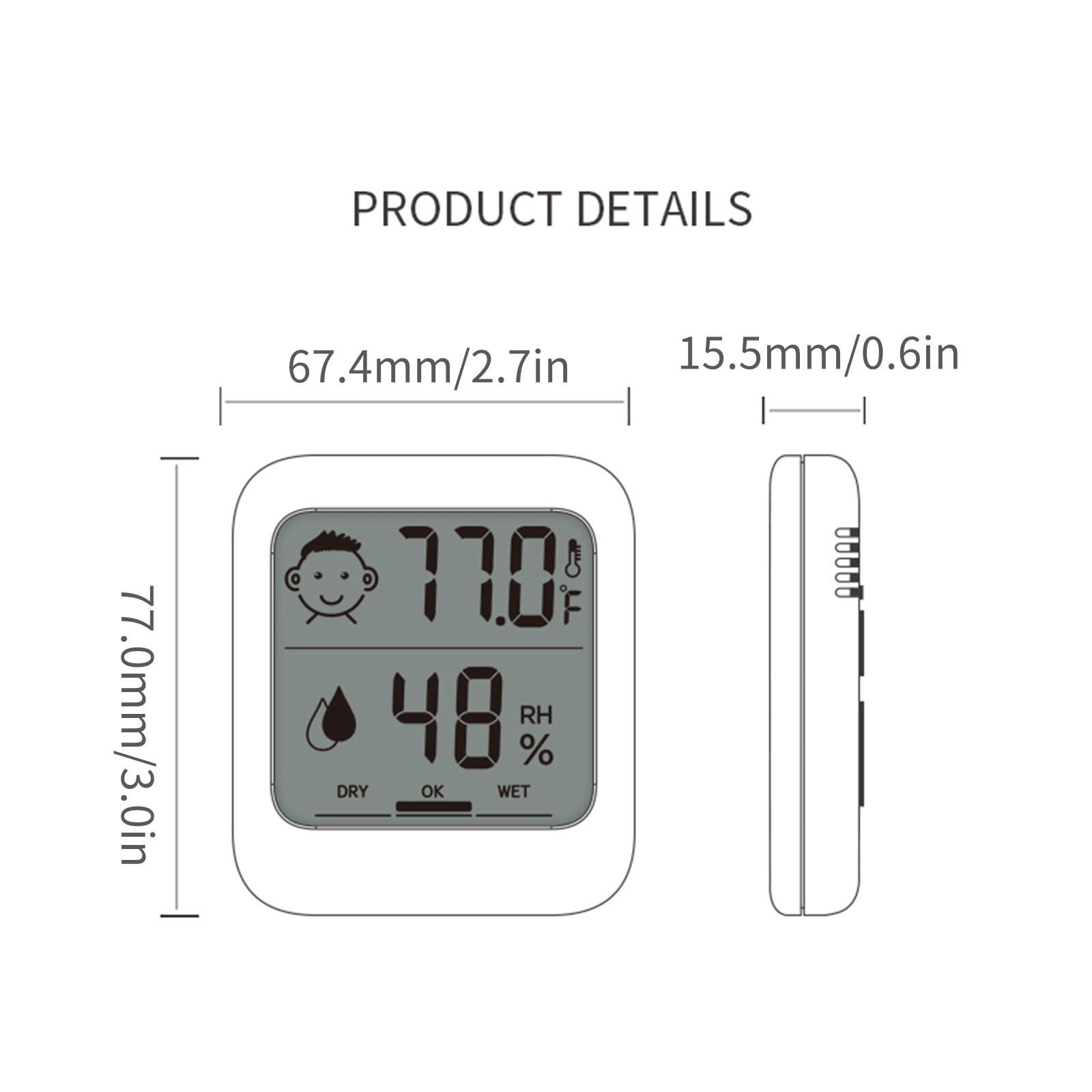 [Manufacturer's warranty] 1 year from purchase [Size]2.7in x 3.0in x 0.6in 1.9oz [Specifications] Temperature range: -4℉ to158℉ Temperature accuracy: ±2℉ (40℉ to 104℉) ±4℉(Other temperature ranges) Humidity range: 25% to 85% Humidity accuracy: ±5% (35% to 75%) ±10% (other humidity ranges) Measurement interval: 10 seconds