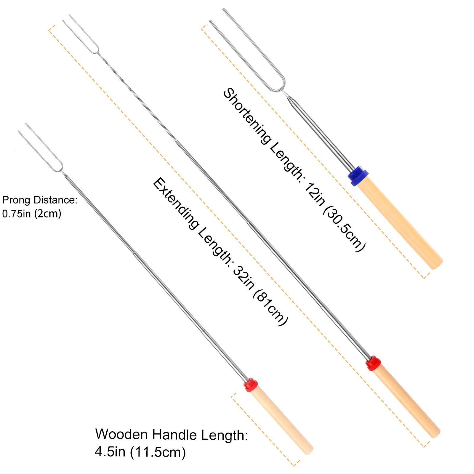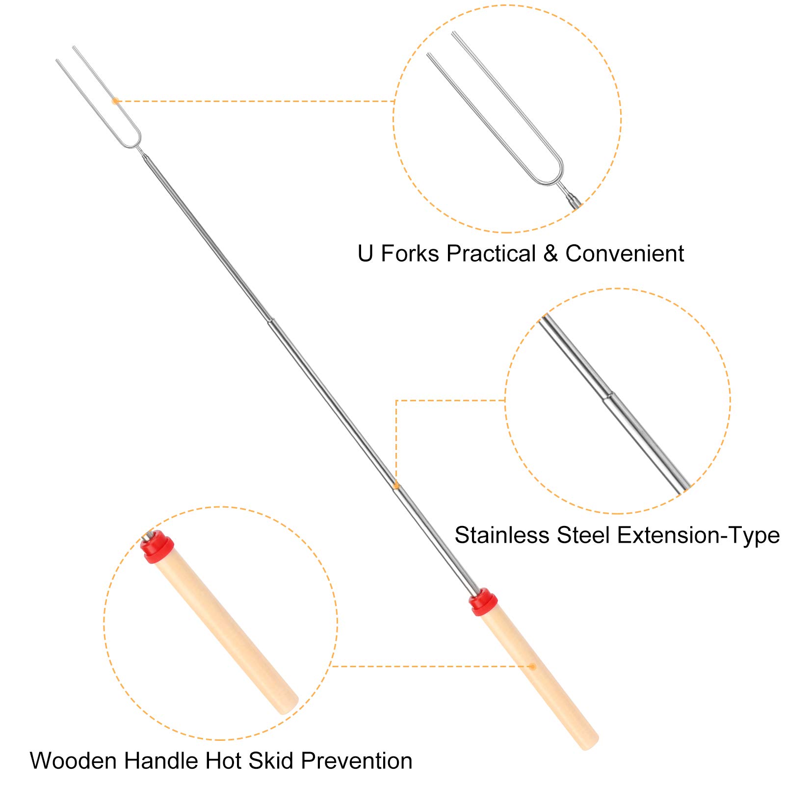 Compact Telescopic Structure: BBQStyle stainless steel smore s forks have adjustable lengths. The collapsible roasting forks can extend from 12 inch to 32 inch. They can be stretched to reach the fire from a distance. It is pretty tight in each layer of the metal rod. The extending roasting sticks features an extended U Shape double forks design, they are strong enough to hold up sausages, hot dogs, veggies, marshmallows. They will be the best extendable toasting fork for open fires you ever have!