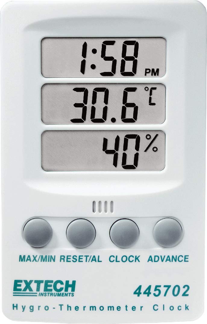 The 445702 combines 3 displays for Time, Temperature and Humidity. Clock displays 12/24 hour time. Maximum/minimum with reset function. Humidity: 10 to 85%. Temp: 14° to 140°F or -10 to 60°C. Accuracy: ±6%RH; ±1.8°F,±1°C. Complete with built-in tilt stand, wall mounting bracket and AAA battery.