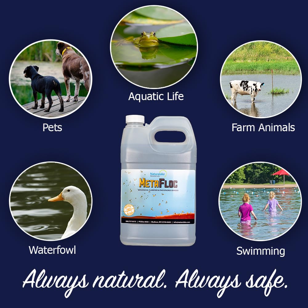 Metafloc has no water use restrictions, is safe for fishing, swimming and other recreation immediately after use- this treatment is safe for humans, pets, livestock, wildlife, and all aquatic life