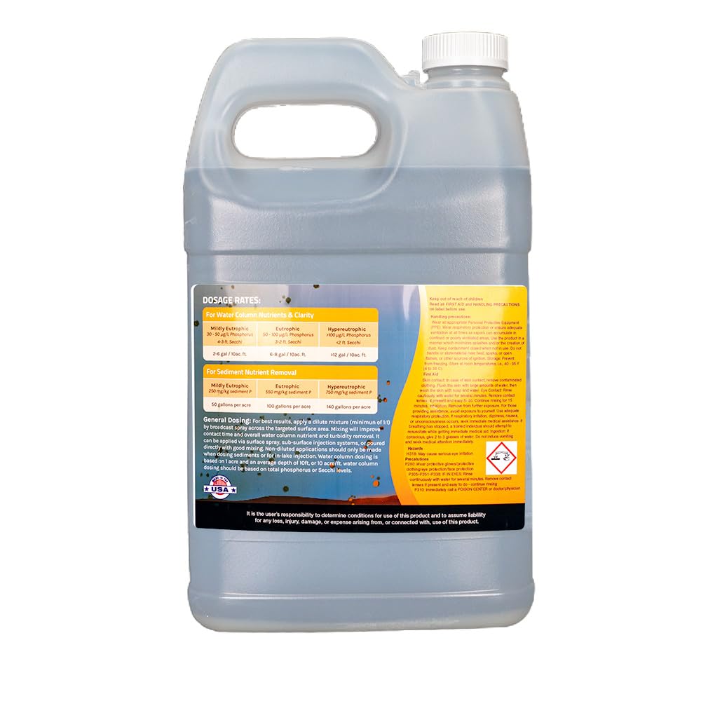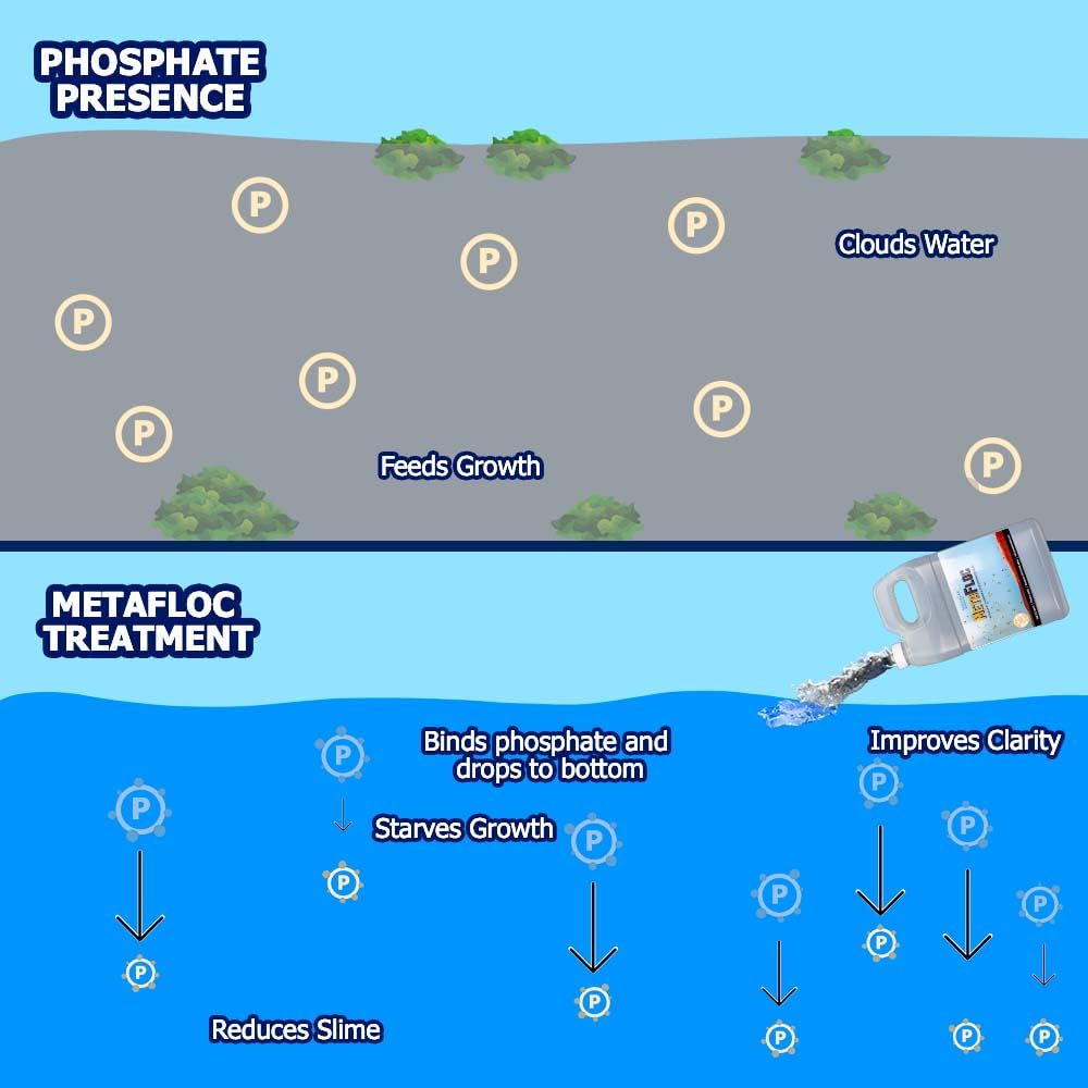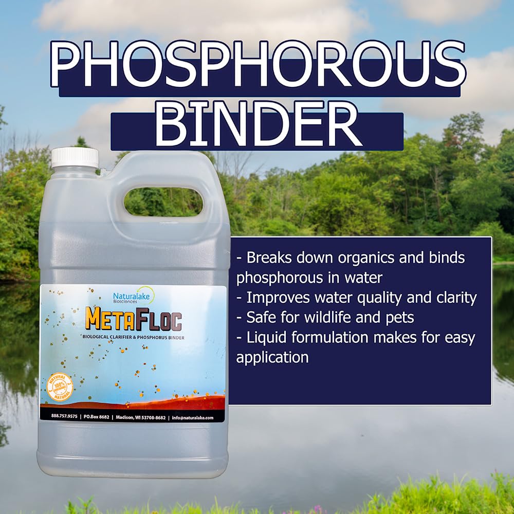 MetaFloc is a one of a kind natural bacteria blended phosphate binder and flocculant treatment. This product creates a natural way to remove dangerously high phosphorus levels in your lake or pond. MetaFloc is a flocculant (particle binder) that improves water clarity and water quality. Unlike other phosphorus binders, Metafloc permanently binds phosphorus in water and sedimentsThis product will not harm any aquatic life, including plants and animals. How to treat: Maintenance dosage rate - 1 gallon per surface area, Rapid phosphate removal rate: 6-8 gallons per surface acre to remove 0.1 mg/L of phosphate. Dilute at 1:1 rate with water and spray over the pond surface. Reapply maintenance dose once per month.
